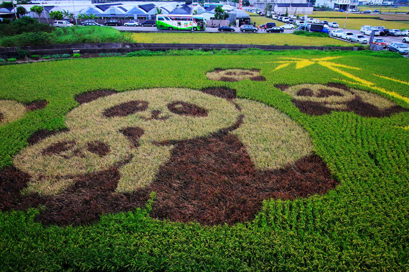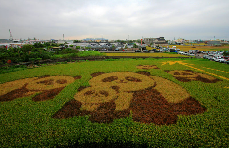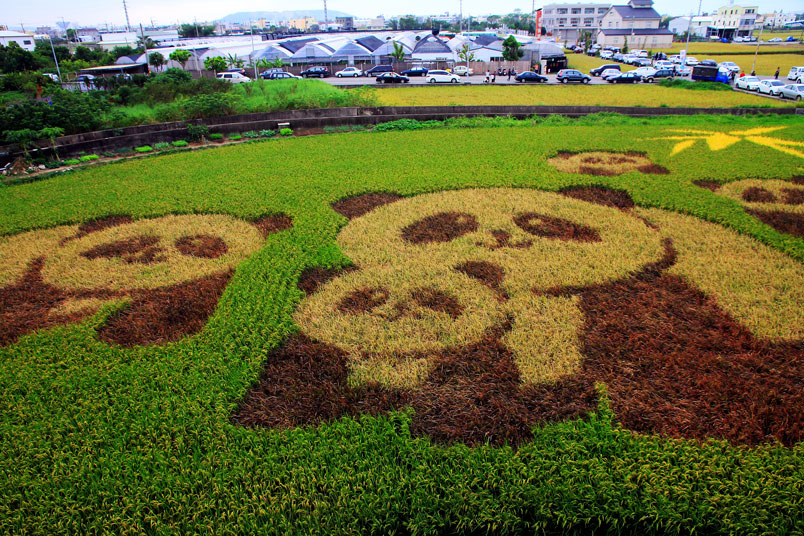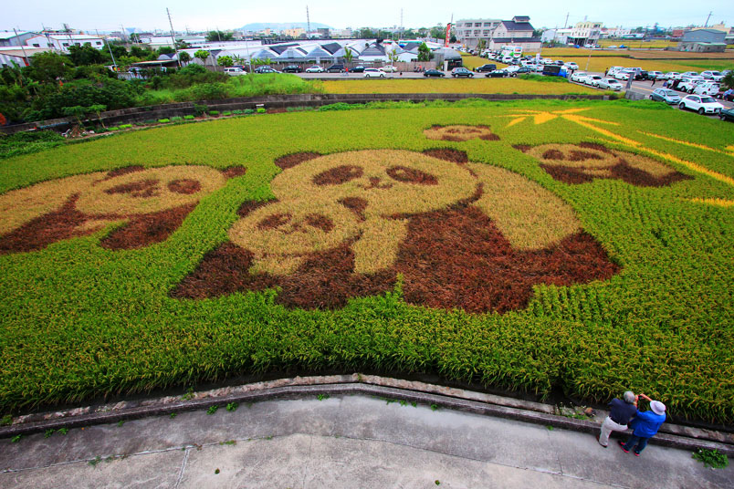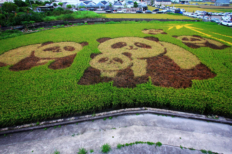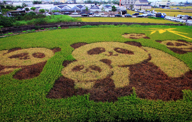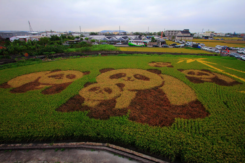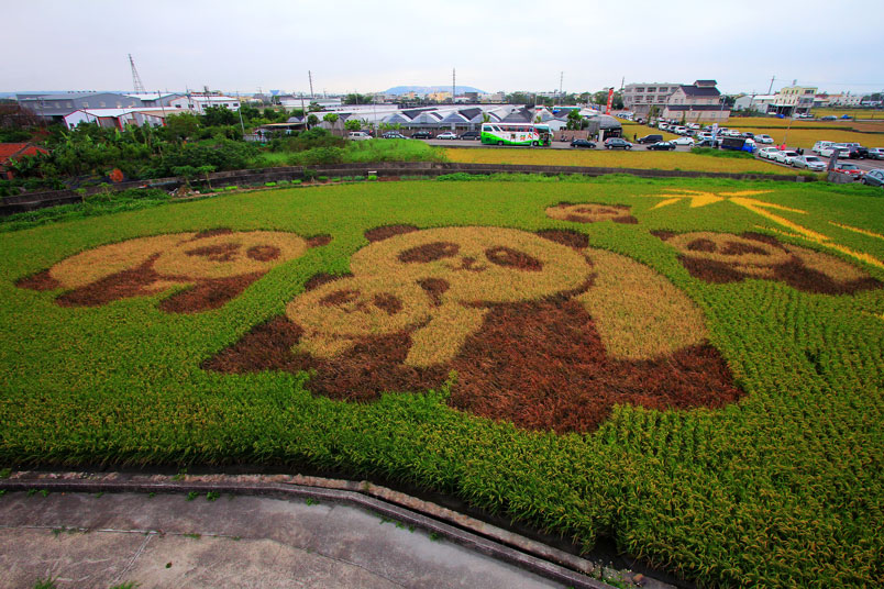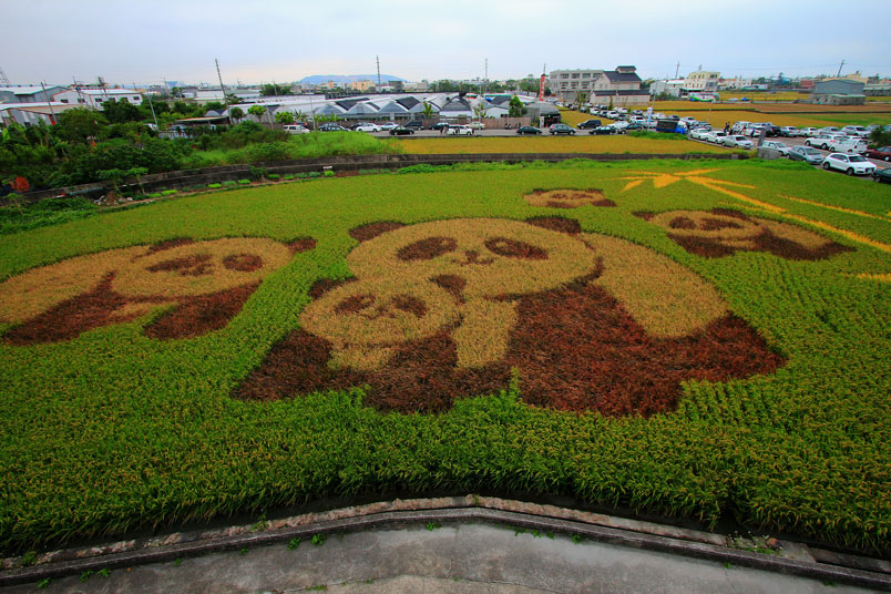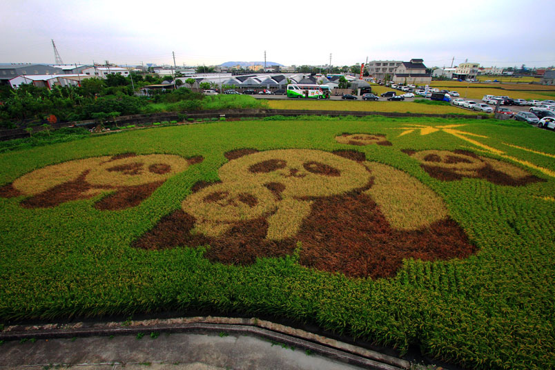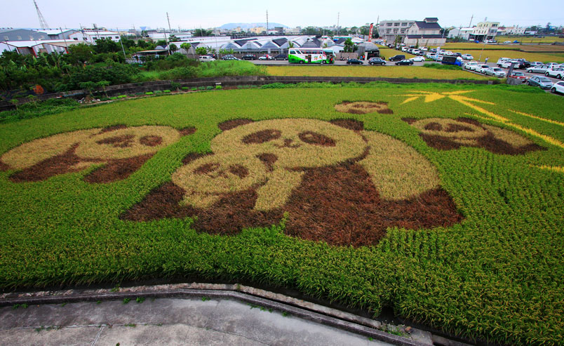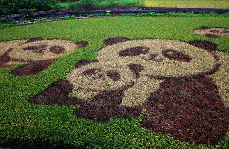 稻米種植出來的熊貓圖案,5隻熊貓悠然浮出於稻田上,