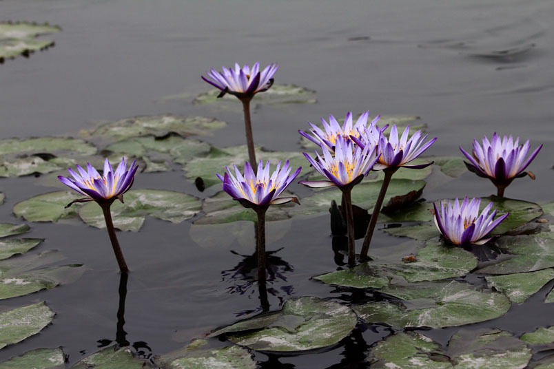 開或夜開,出水或浮水,花色有紅、白、紫、藍、黃等各