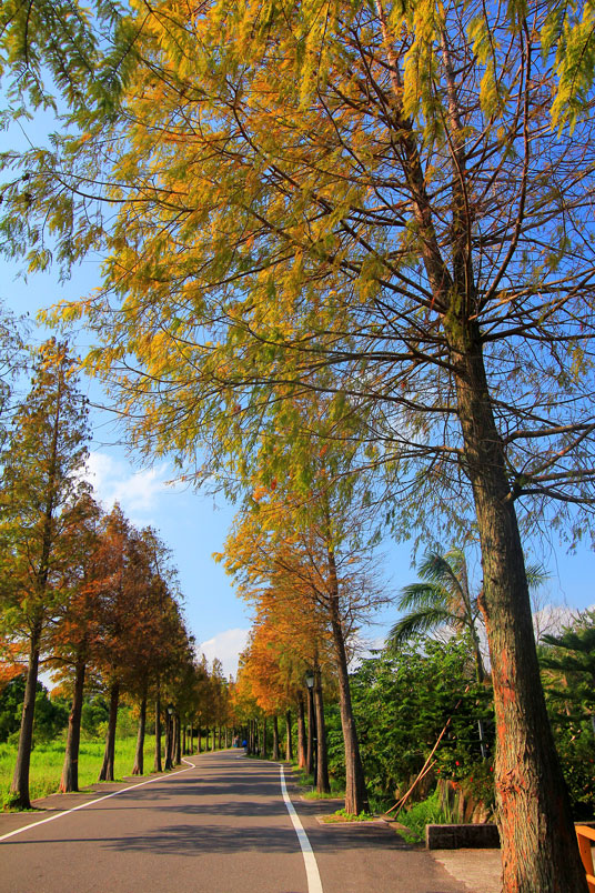 綿延一公里長的落羽松大道,在美麗的蔚藍天空下,剛開
