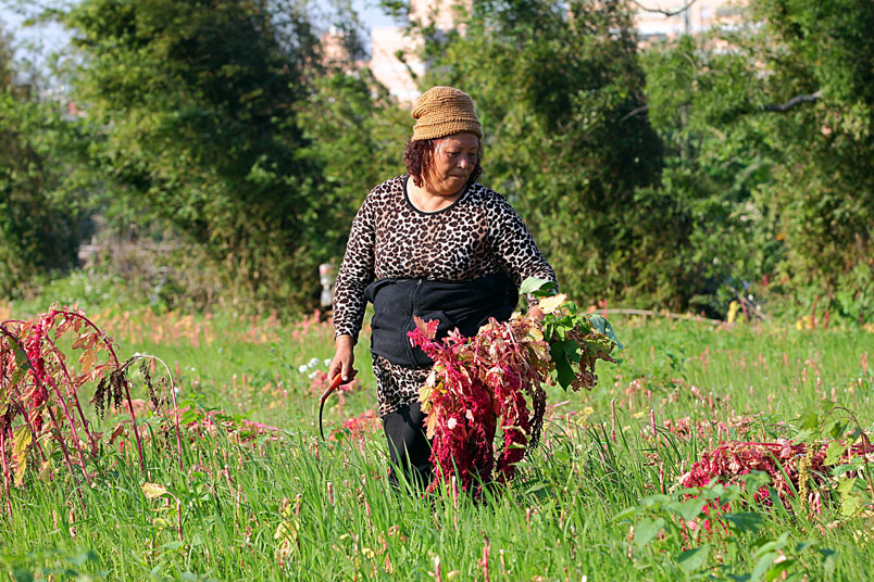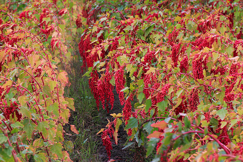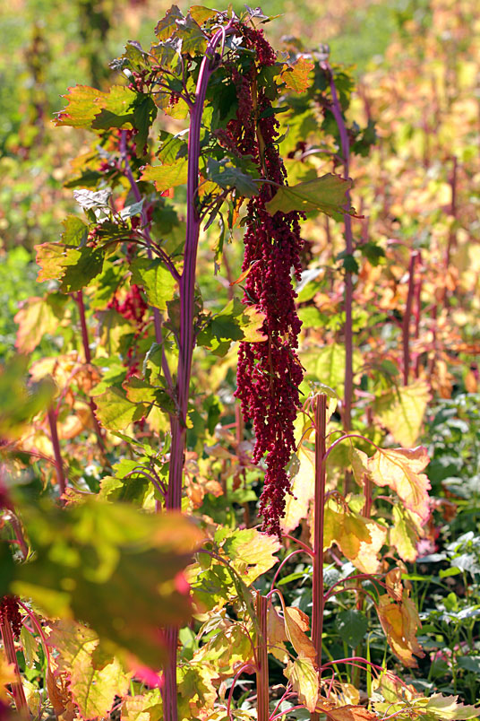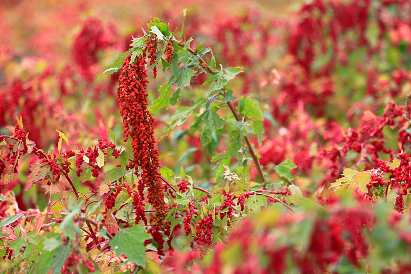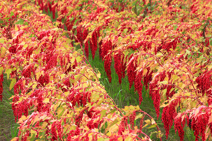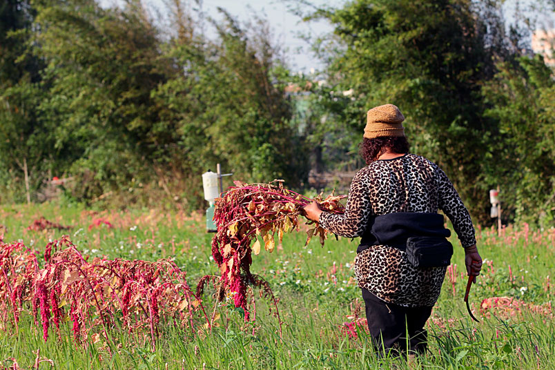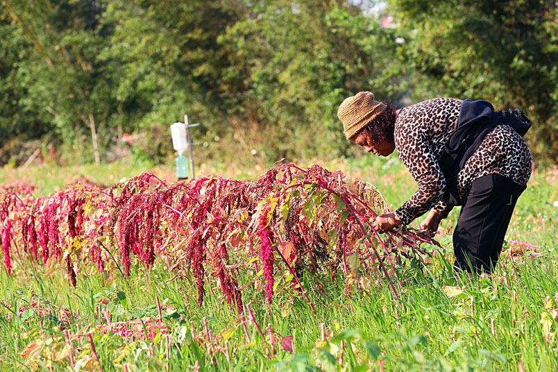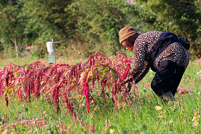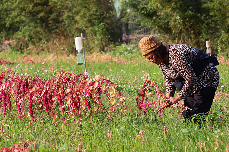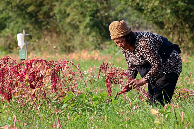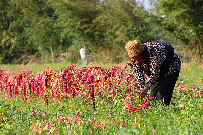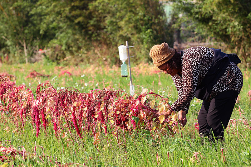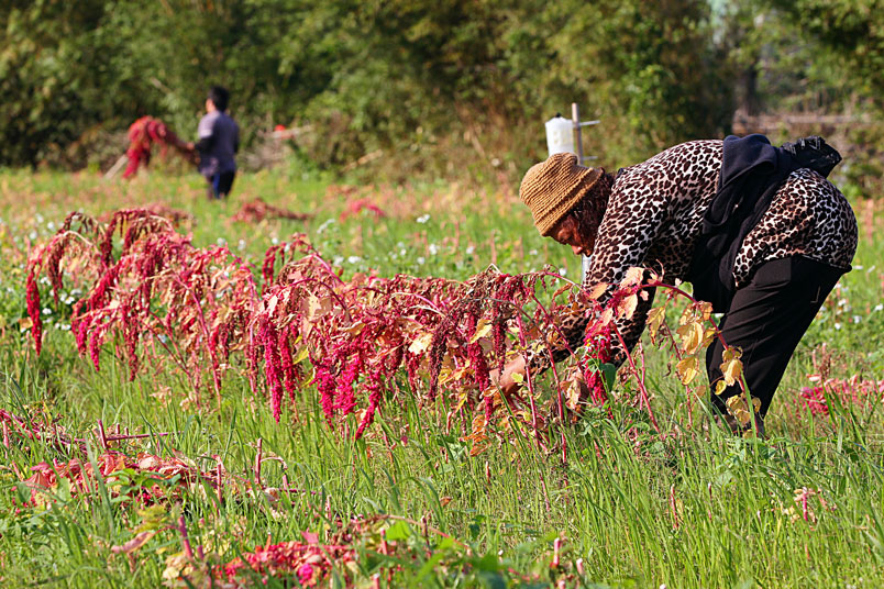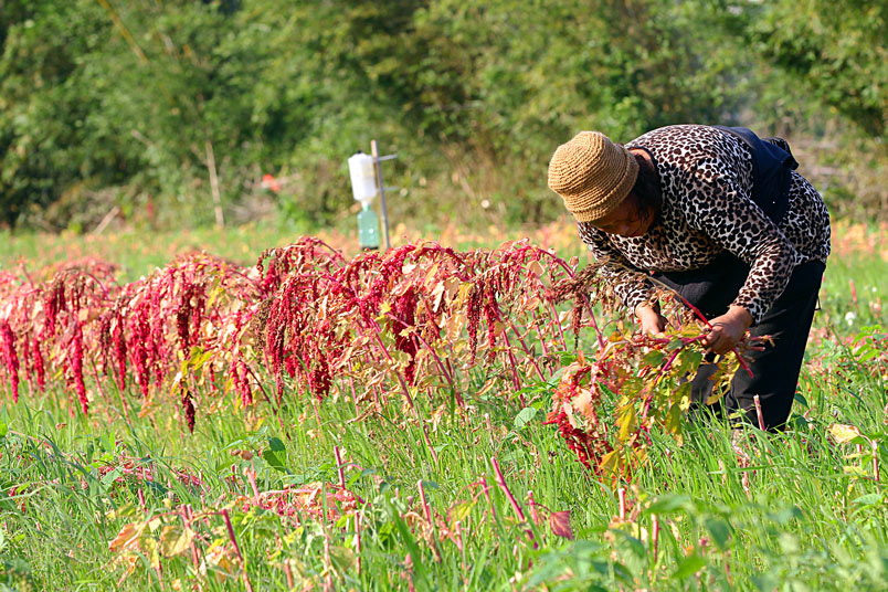 手中的鐮刀,割下美麗的紅寶石,一綑一綑七彩繽紛的紅藜等