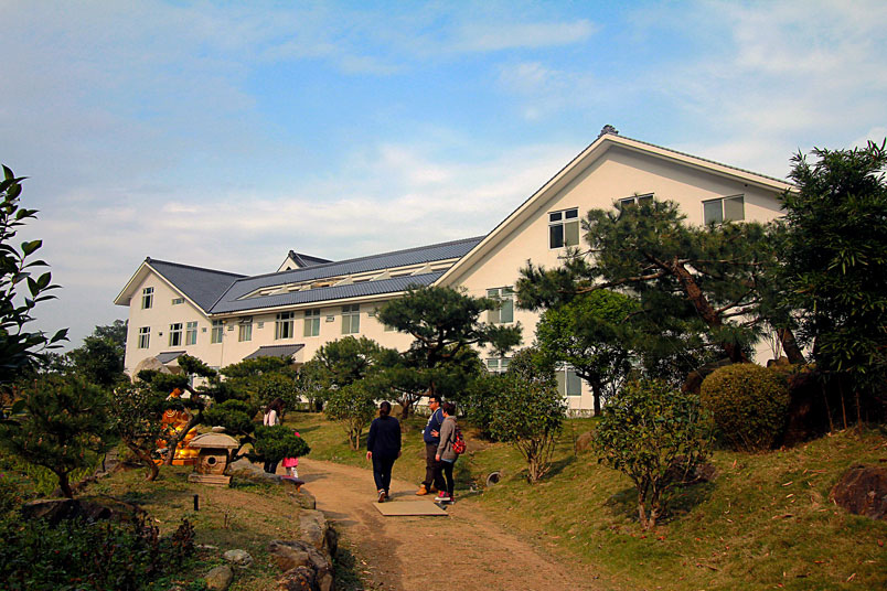 ,淨苑主體建築採黑瓦白牆設計,在青翠山林襯托下,顯得典