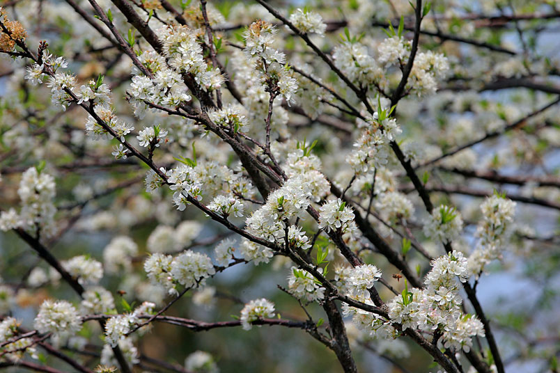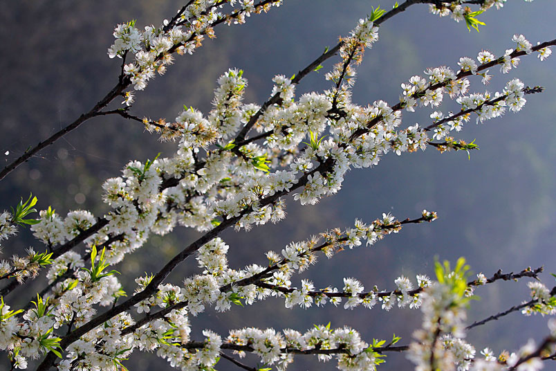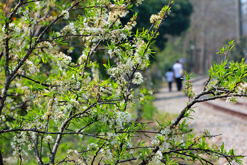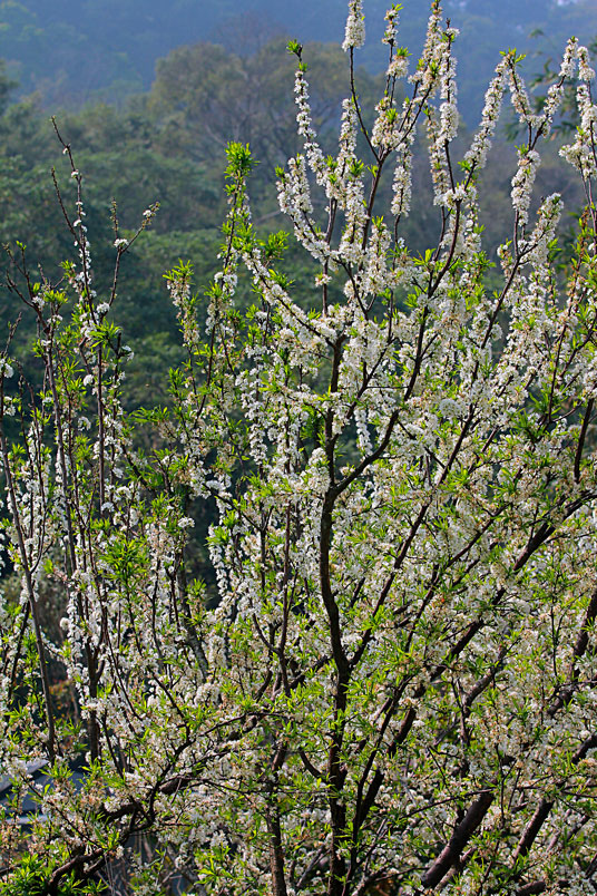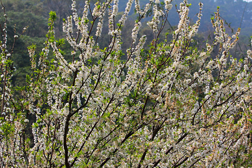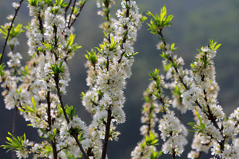 麗日風和暖,漫山李正開,盈林銀綴簇,滿樹雪成堆,