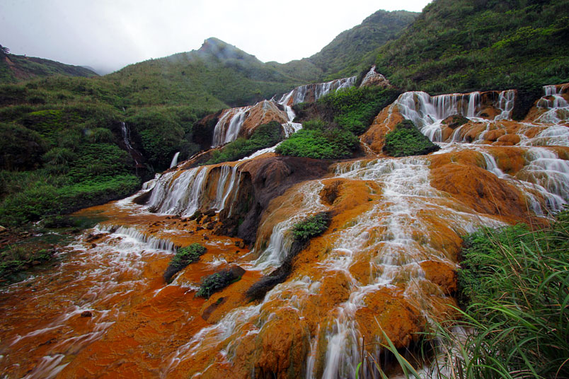 瀑布水呈現金黃偏橘色的酸礦水,後人美其名為「黃金
