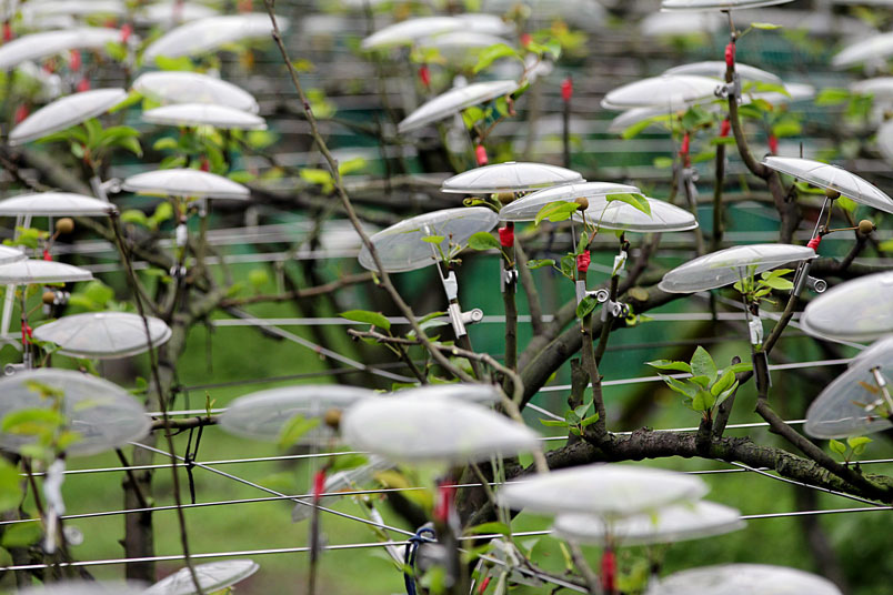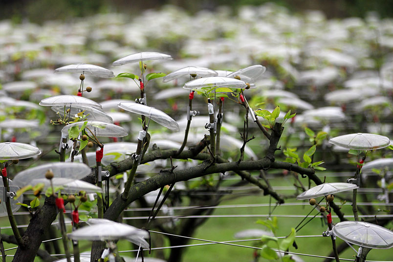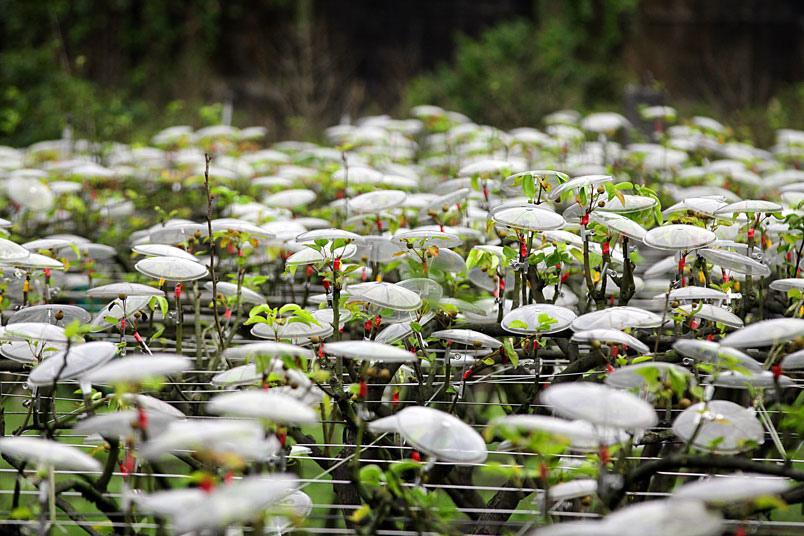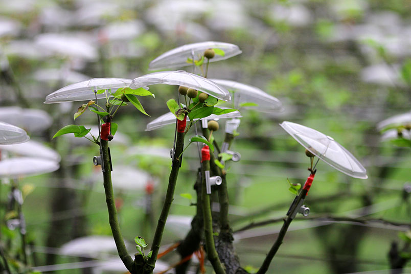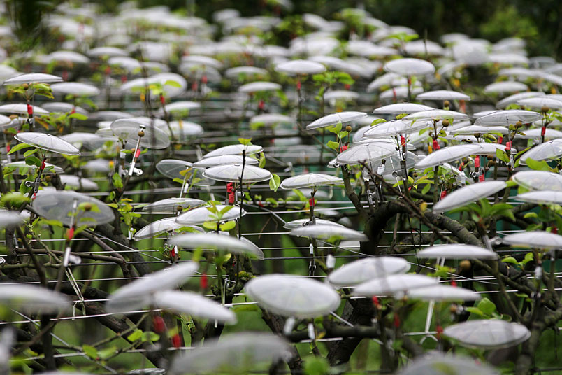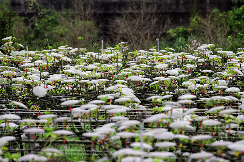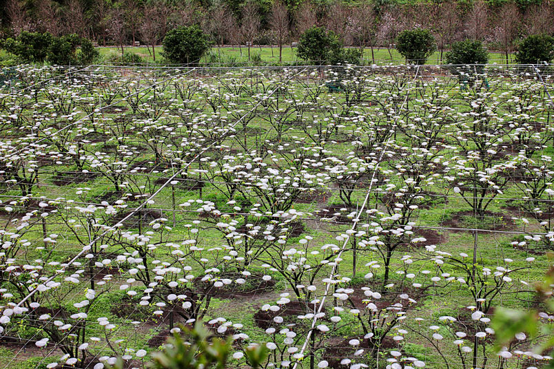 一朵一朵白色傘花開遍整座農園,靠近一看,原來是掛在梨