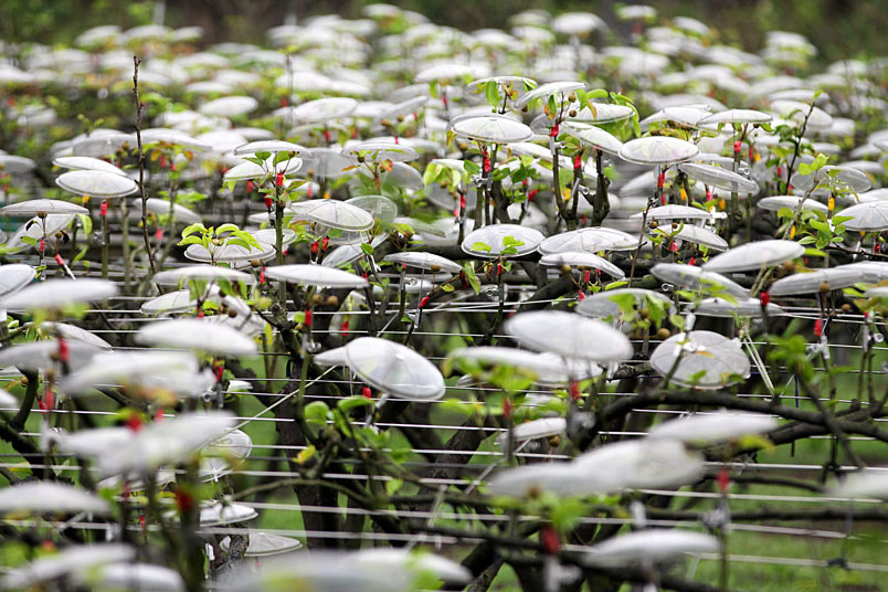 小雨傘就罩在滿園的梨樹上,形成鋪天蓋地的壯麗景觀。我