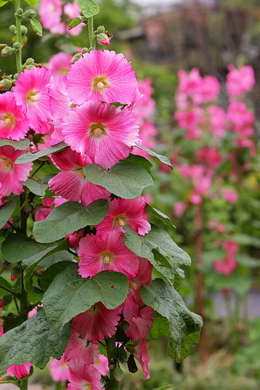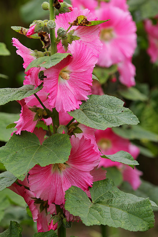 蜀葵的莖直立,高度約一至二公尺以上,葉為有裂縫大型心
