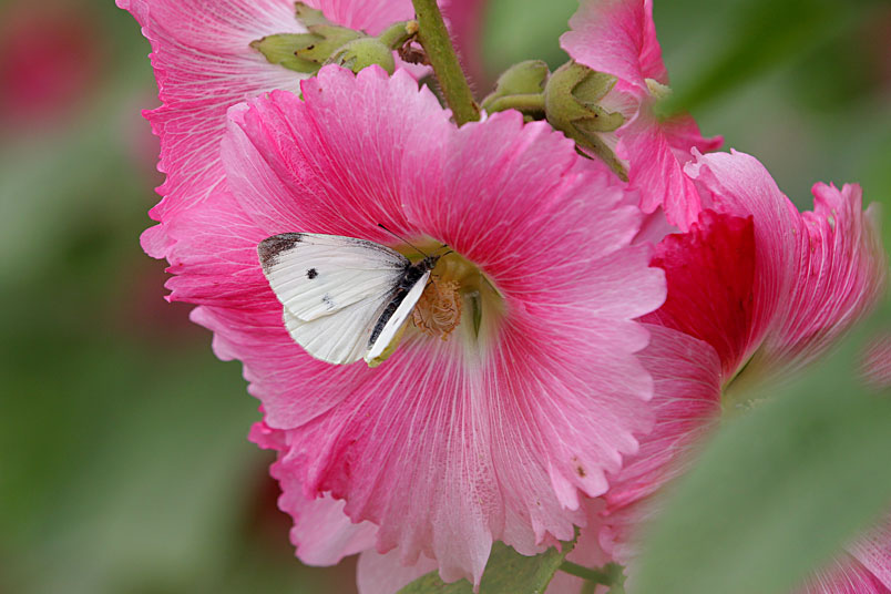 翩翩蝴蝶成雙過,兩兩蜀葵相背開。