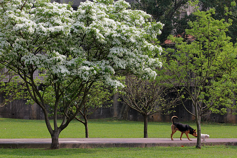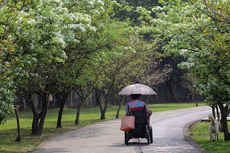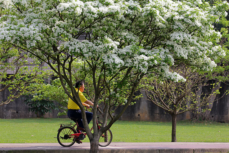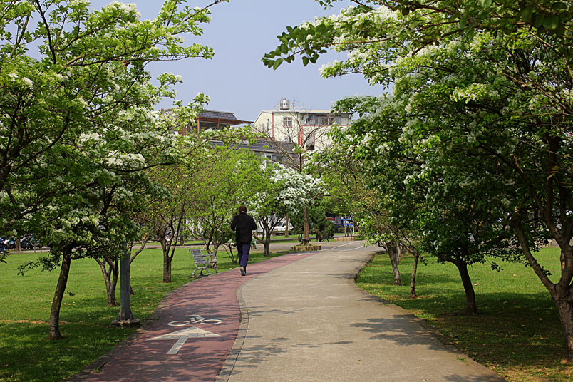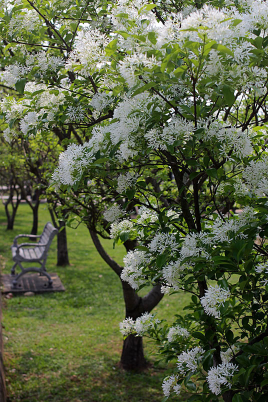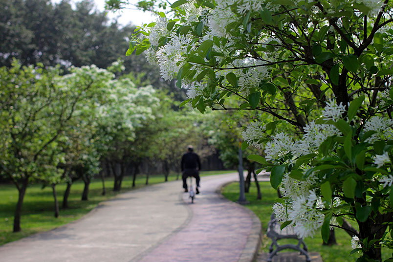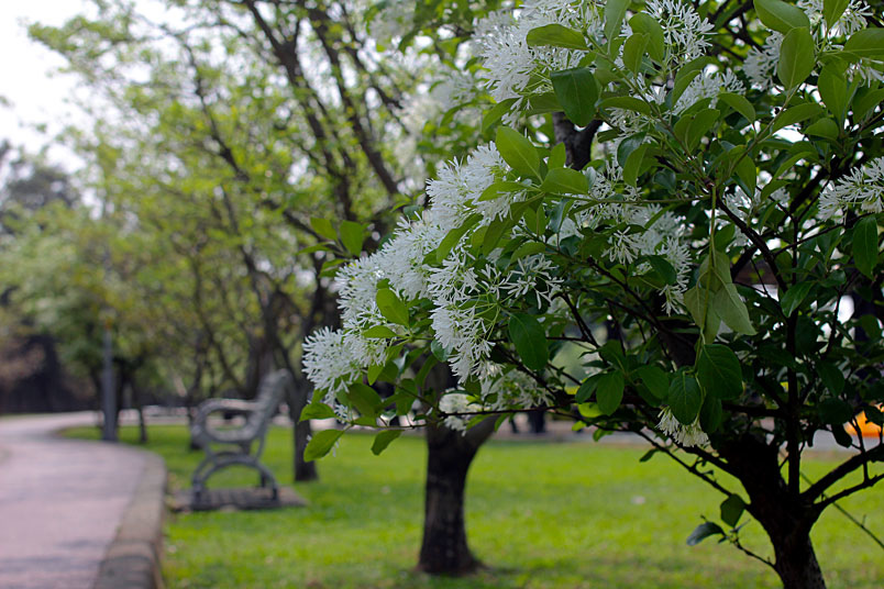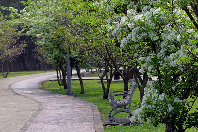 月,一整排的流蘇盛開,宛如下了一場四月雪,為公園增色