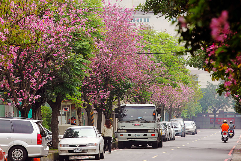 四月天正是羊蹄甲盛開時節,滿樹桃紅色花朵同時綻放,遠