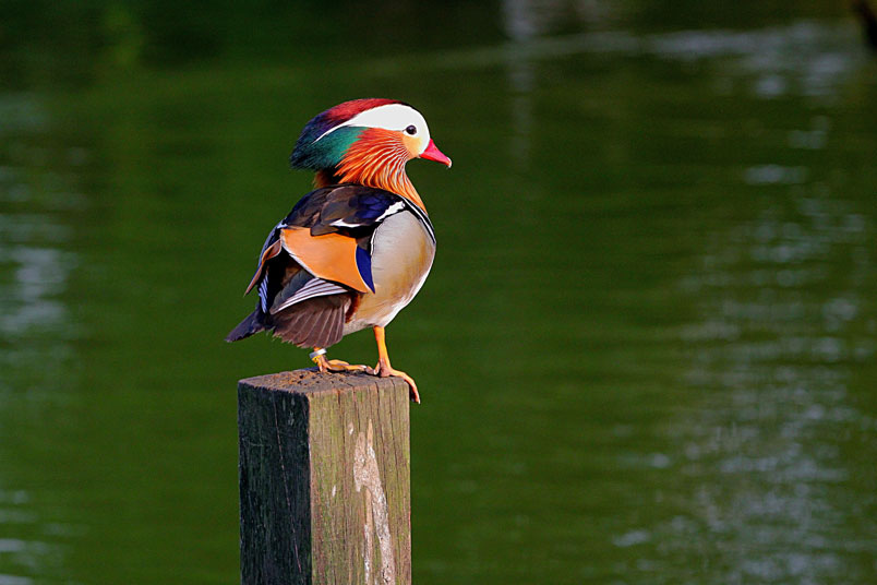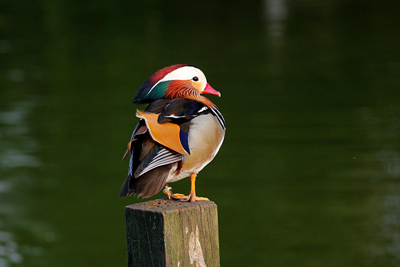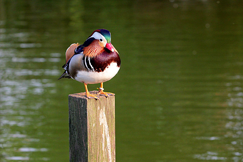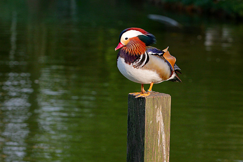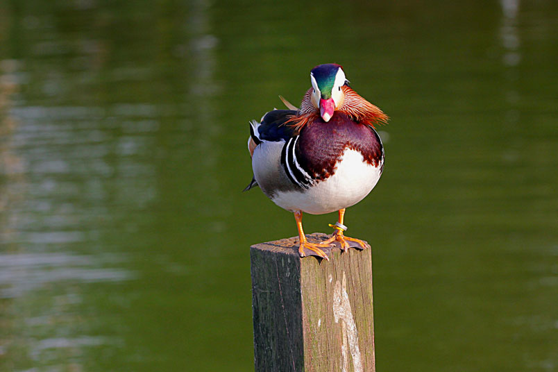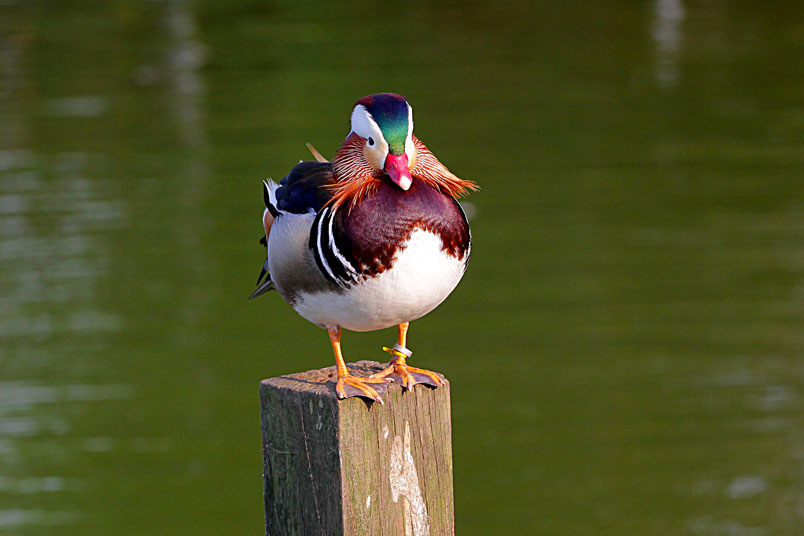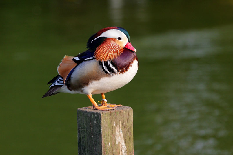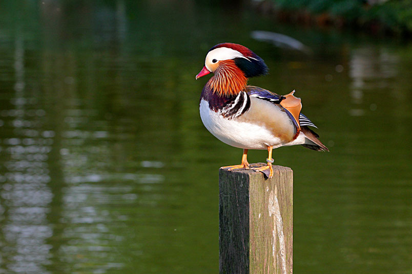 鴛鴦體長約45公分,雄鳥羽色豔麗,嘴喙橙紅色,眼環白色,
