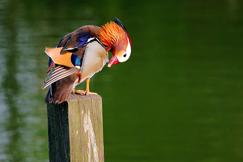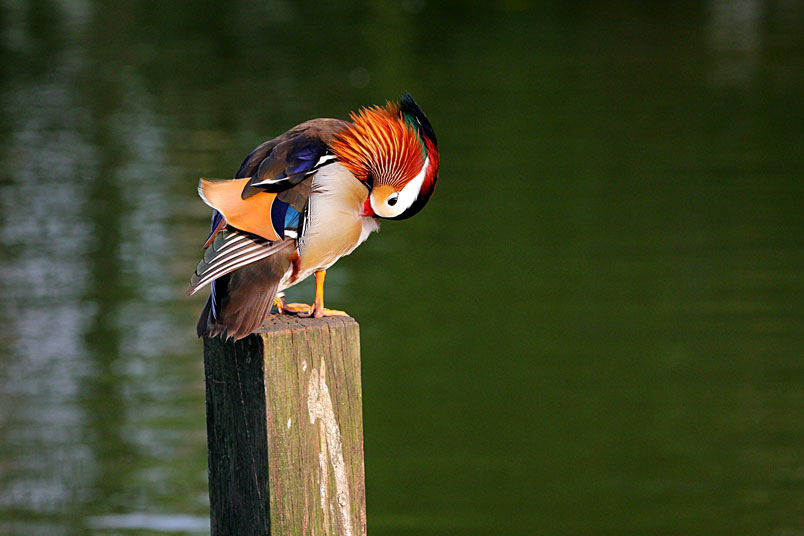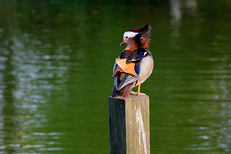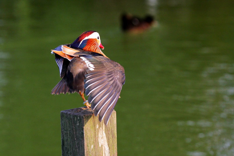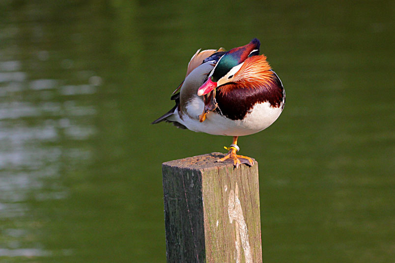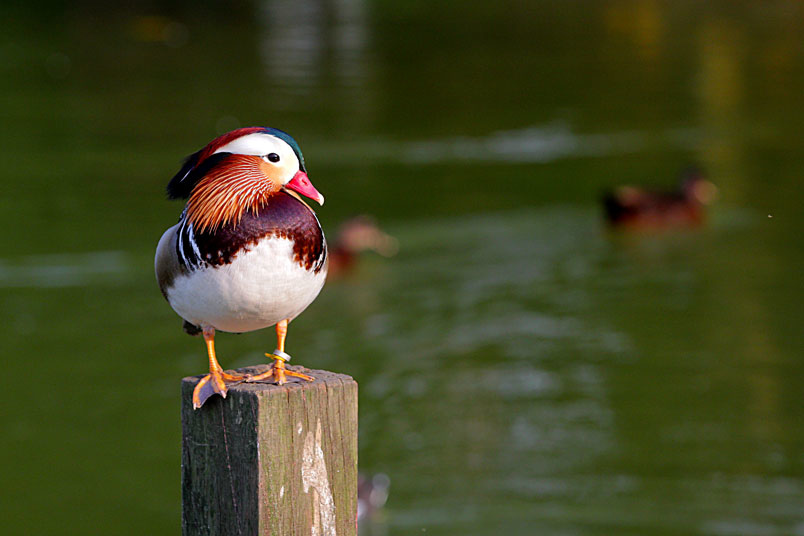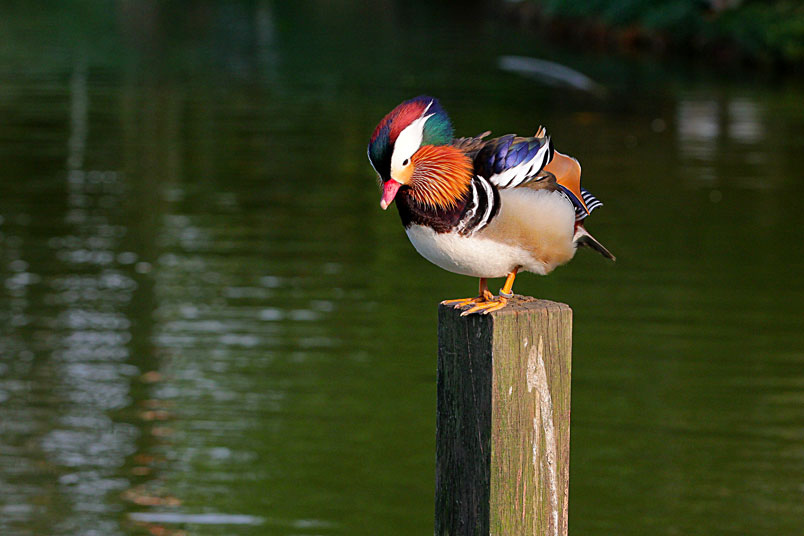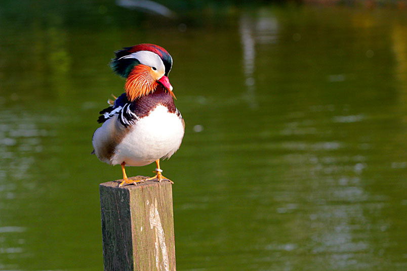 鴛鴦體長約45公分,雄鳥羽色豔麗,嘴喙橙紅色,眼環白色,