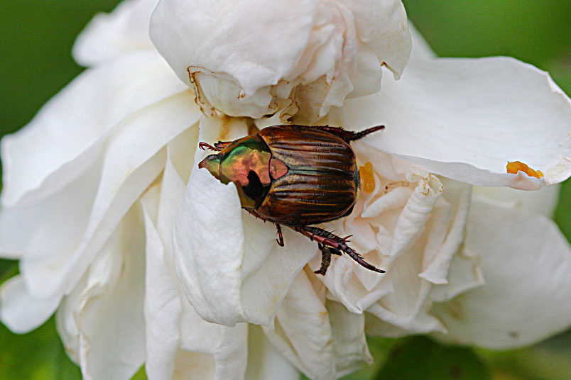 台灣豆金龜具有群集性,只為害玫瑰花朵,造成缺刻,失去商