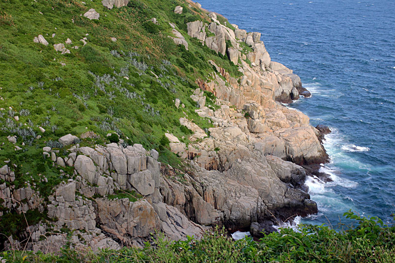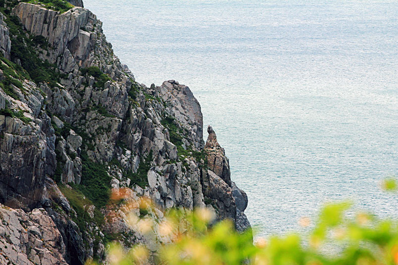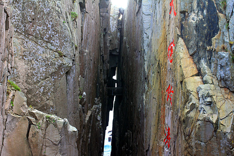 兩岩壁垂直相鄰至相接,上接天、下通海,底部海浪拍擊石塊,如