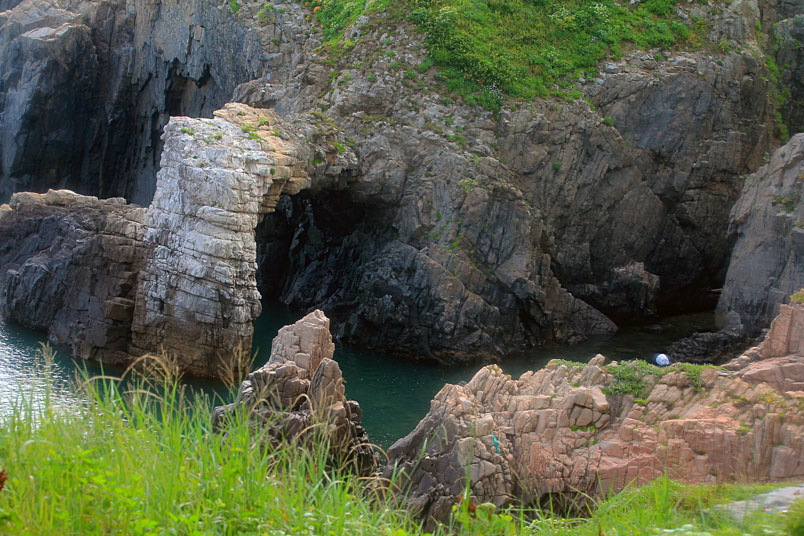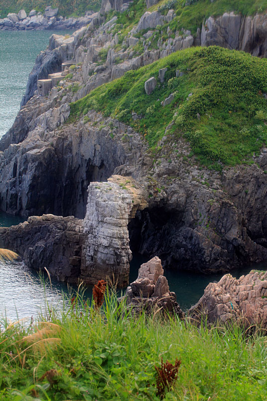 東引島北澳口,岩盤經年累月遭受海浪衝擊,衝刷成為奇特的海蝕門