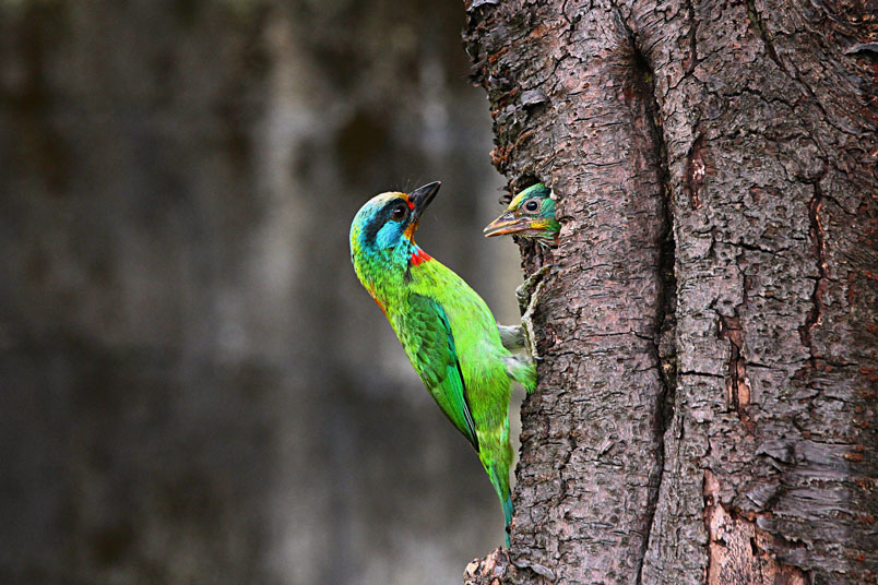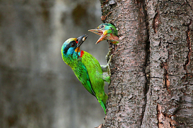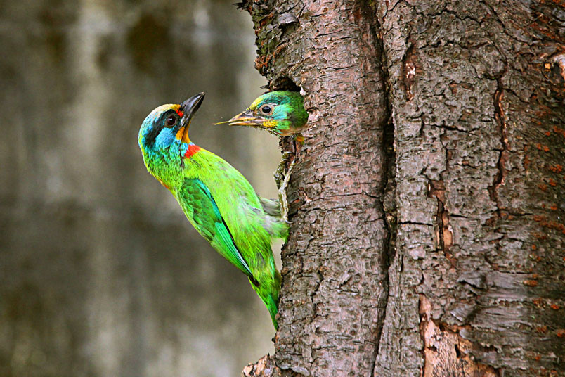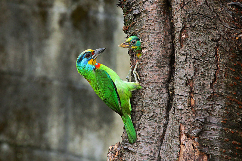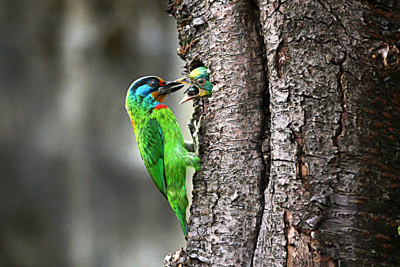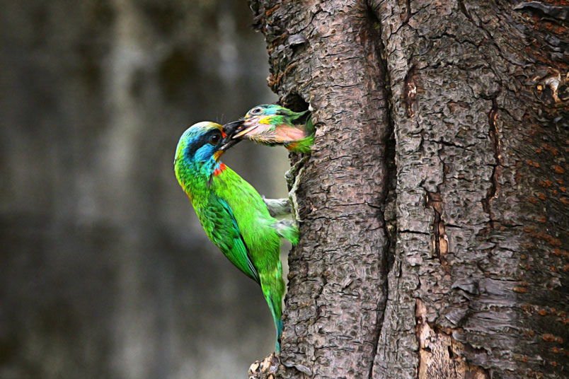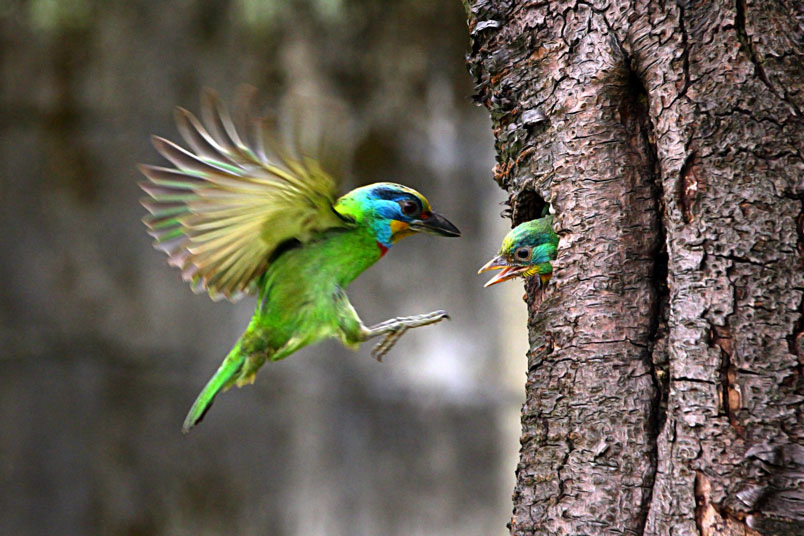 五色鳥為一夫一妻制,繁殖期為4月至8月,在枯朽的樹幹上鑿