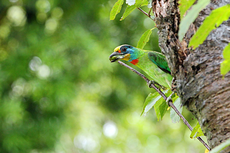 五色鳥,台灣特有亞種,雌雄同色,為普遍的留鳥,生活於平