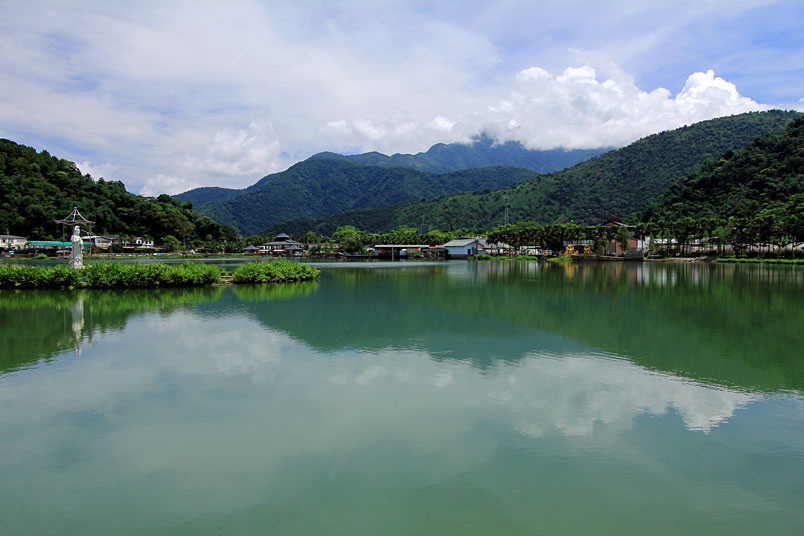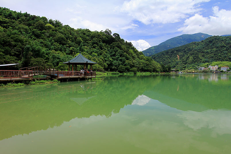 鯉魚潭潭水長年清澈碧綠,四面山巒綠意環抱清幽寧靜,閒步漫