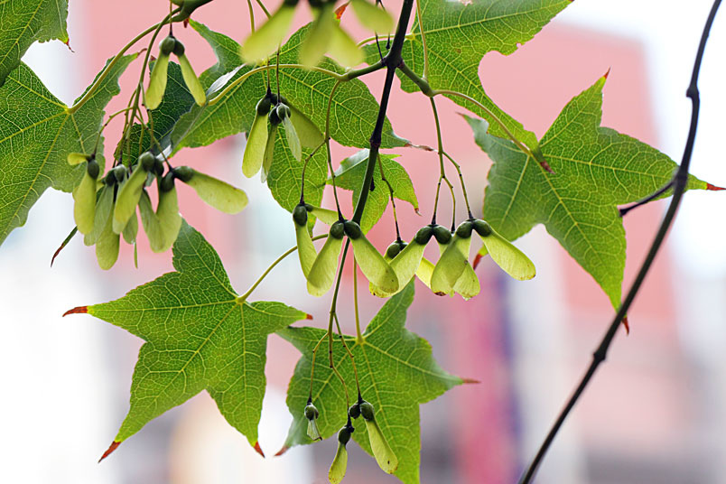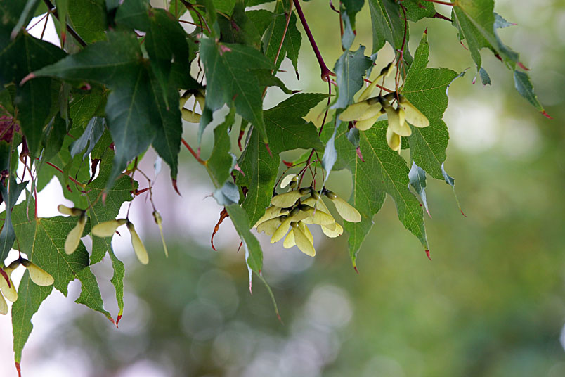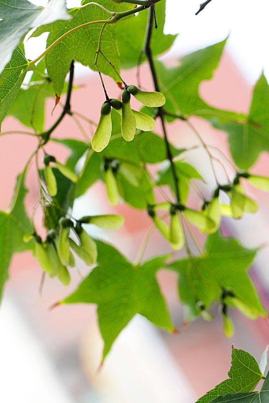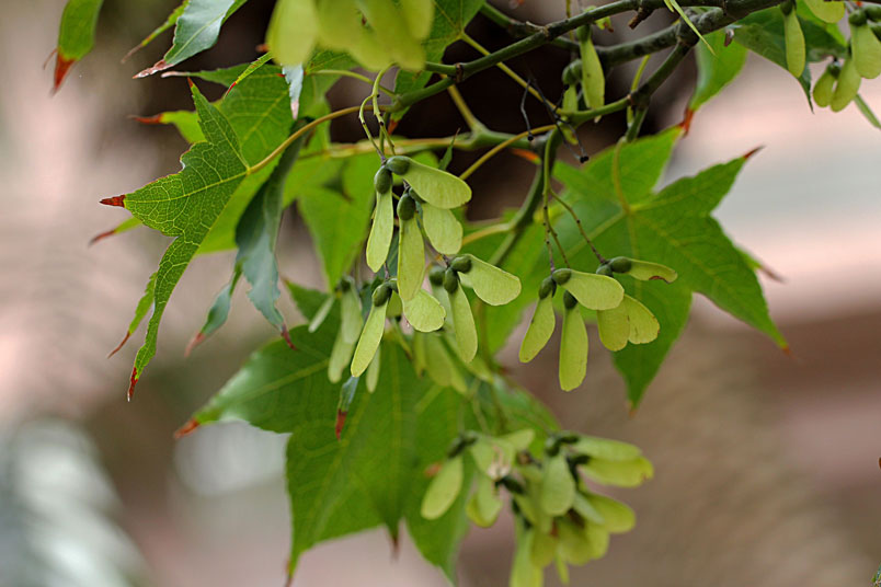 青楓的果實有一對翅脈明顯的翅膀,成「人」字 形構造,每邊各