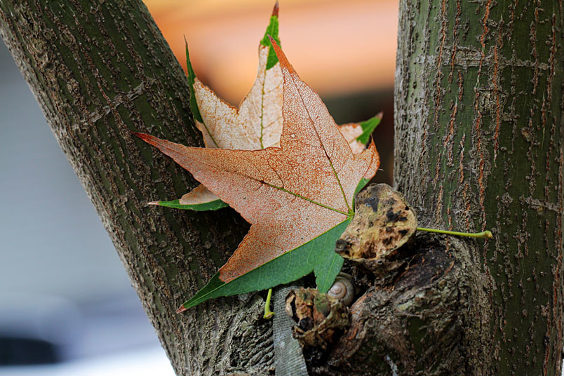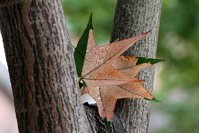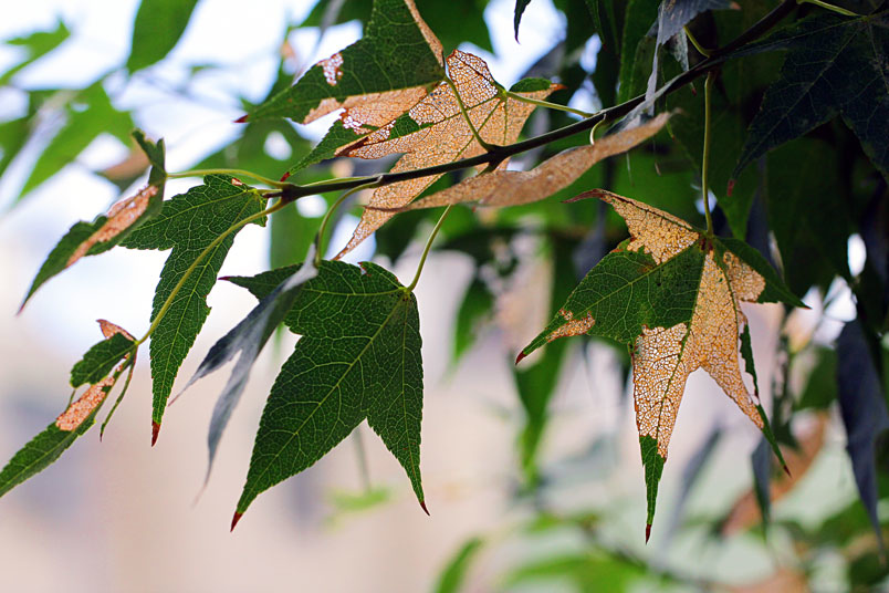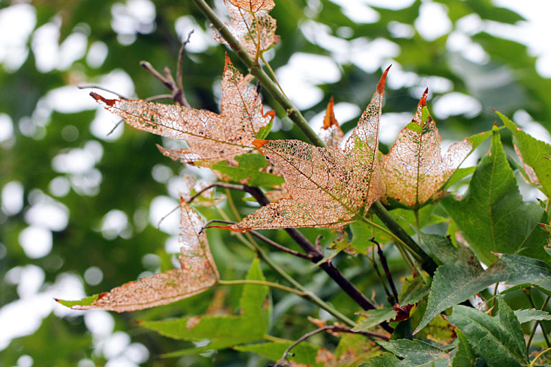 青楓的葉片遭受昆蟲嚼食後,葉肉消失的部位會留下鮮明的網狀