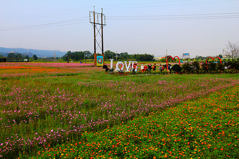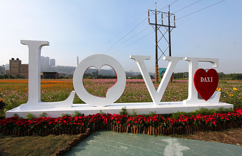 花海中有寫著「Love」的現代風裝置藝術,稻田旁則有以稻草做的逗
