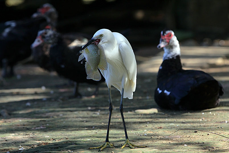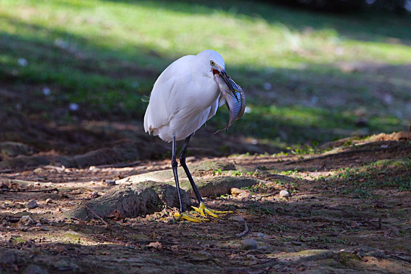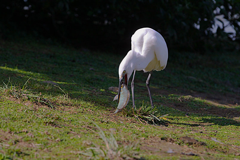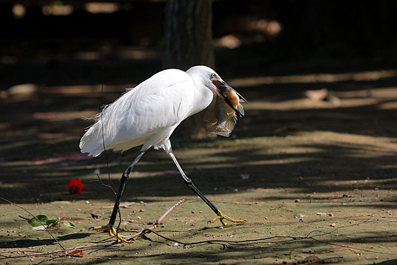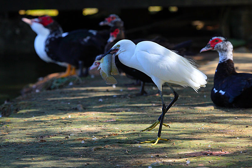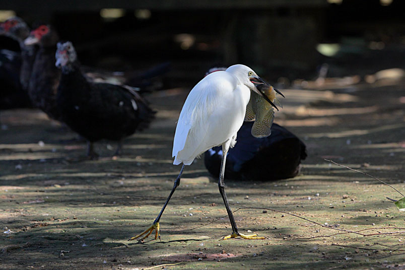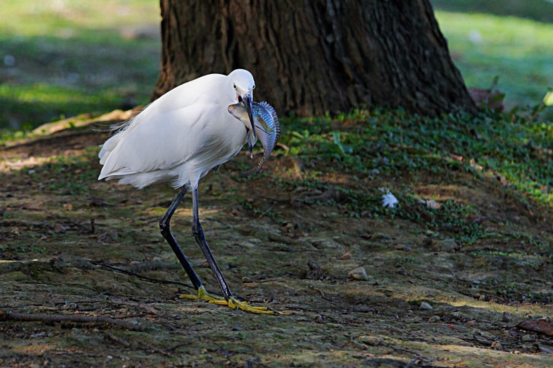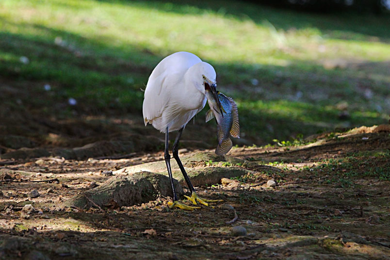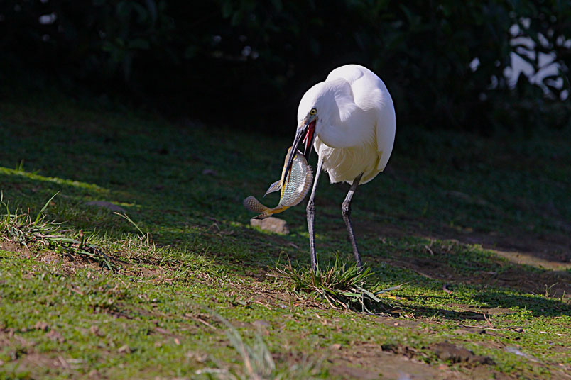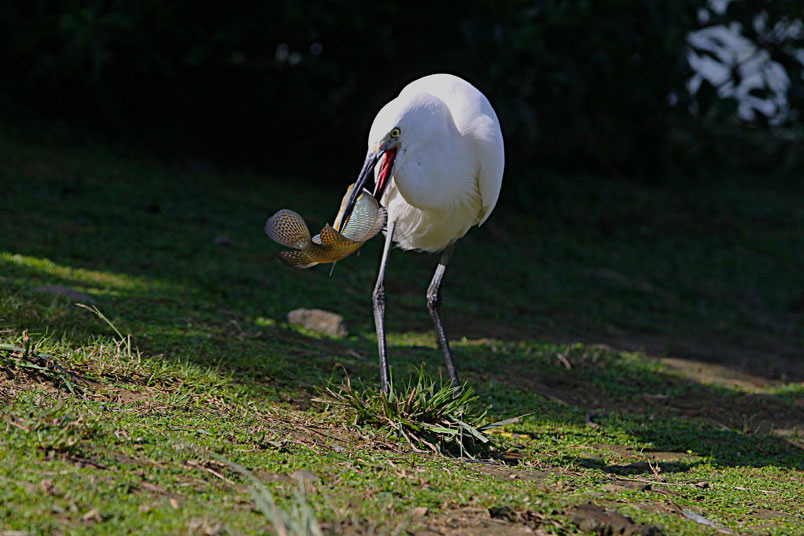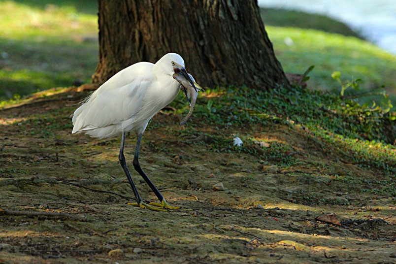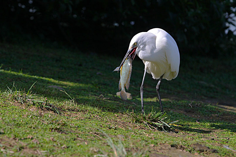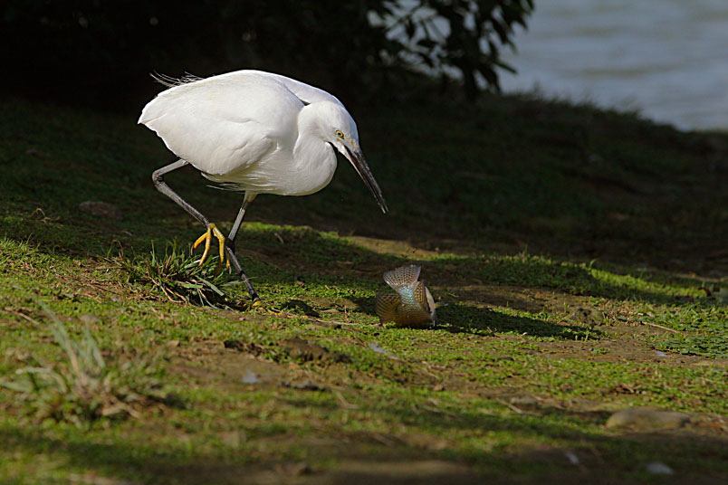 到魚兒游累,動作變的緩慢時,小白鷺就會輕輕鬆鬆的把牠抓