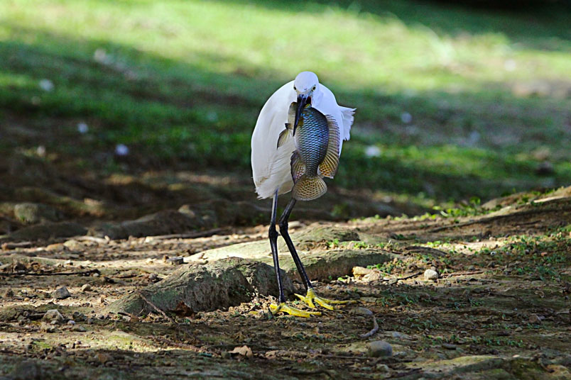 沒有水鳥停駐。忽然看見一隻白鷺,捕捉到一隻不小的福壽魚