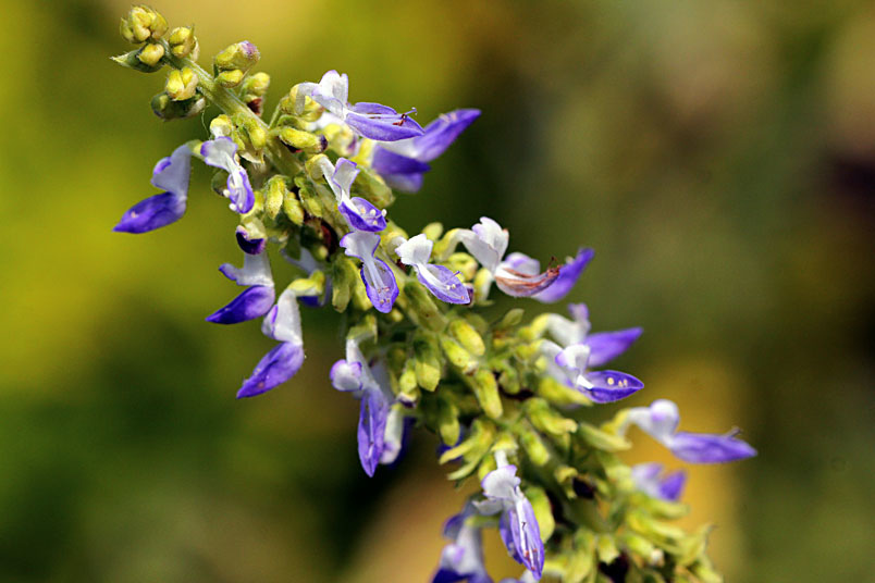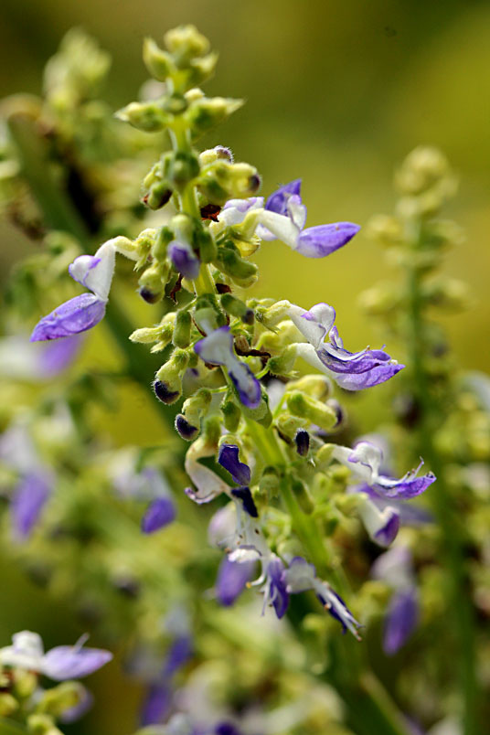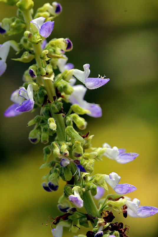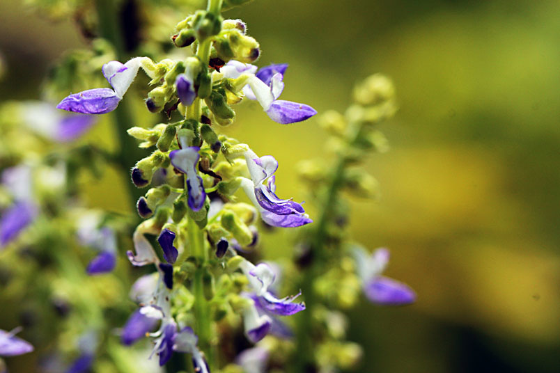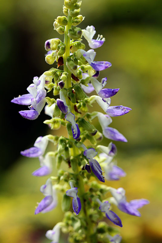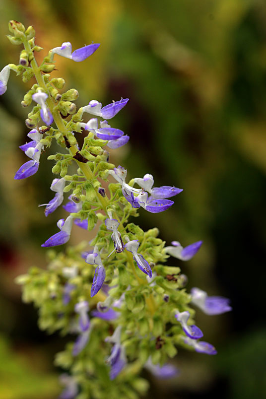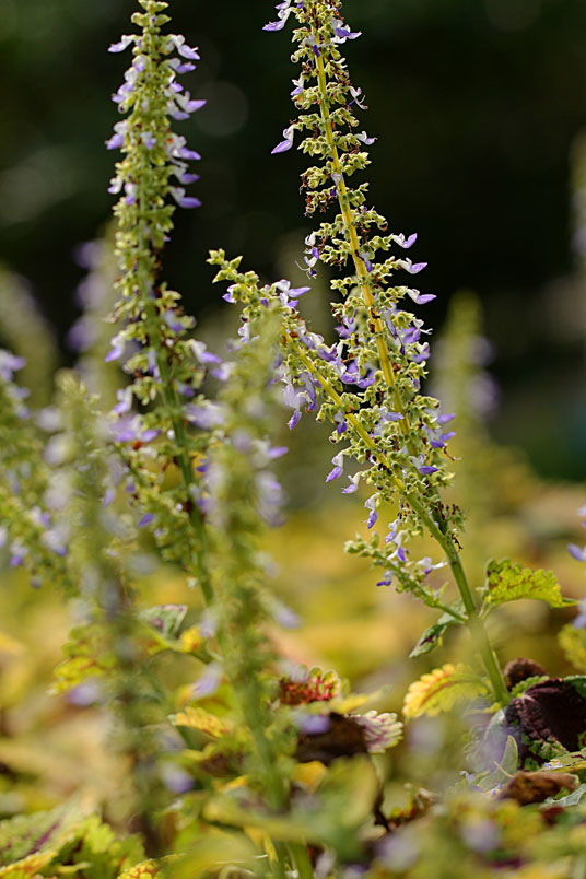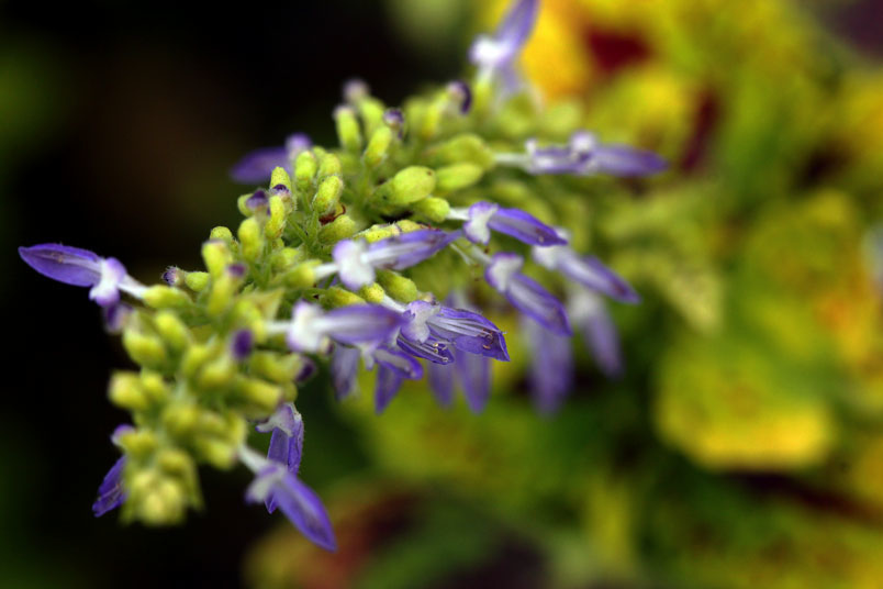 會抽出花序,彩葉花的花為直立穗狀,小花藍紫色,花朵稀疏,觀