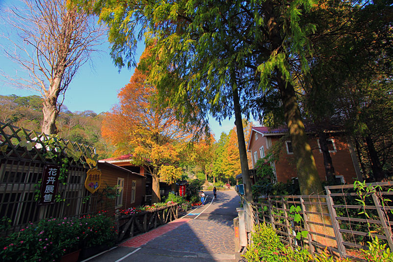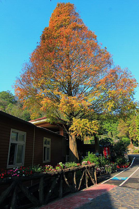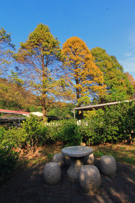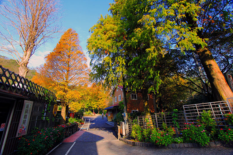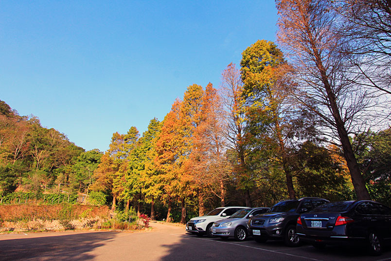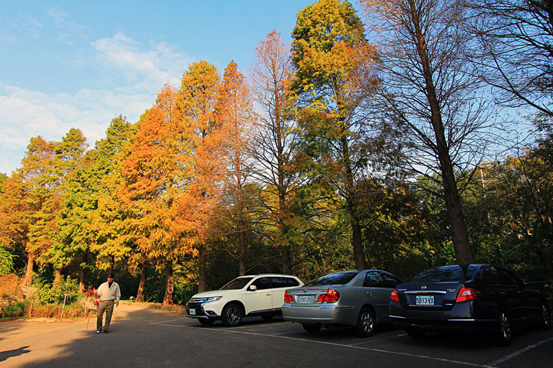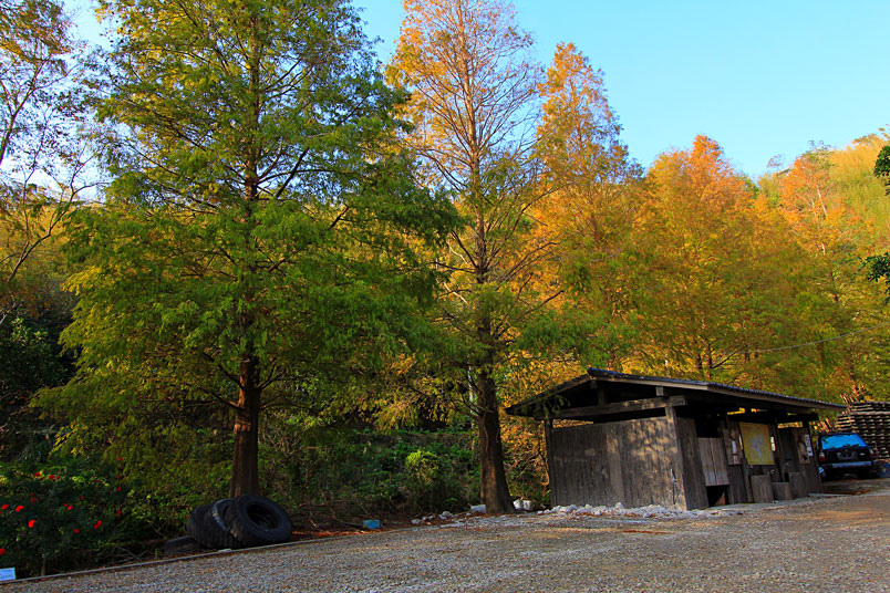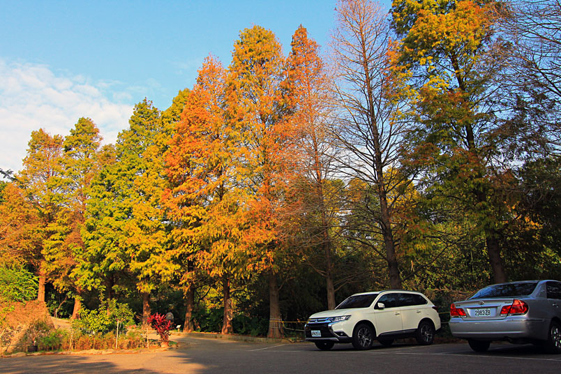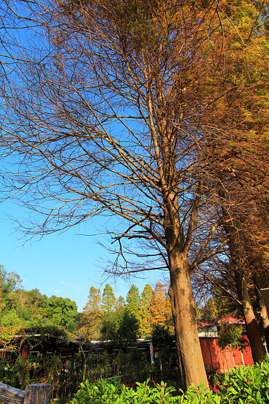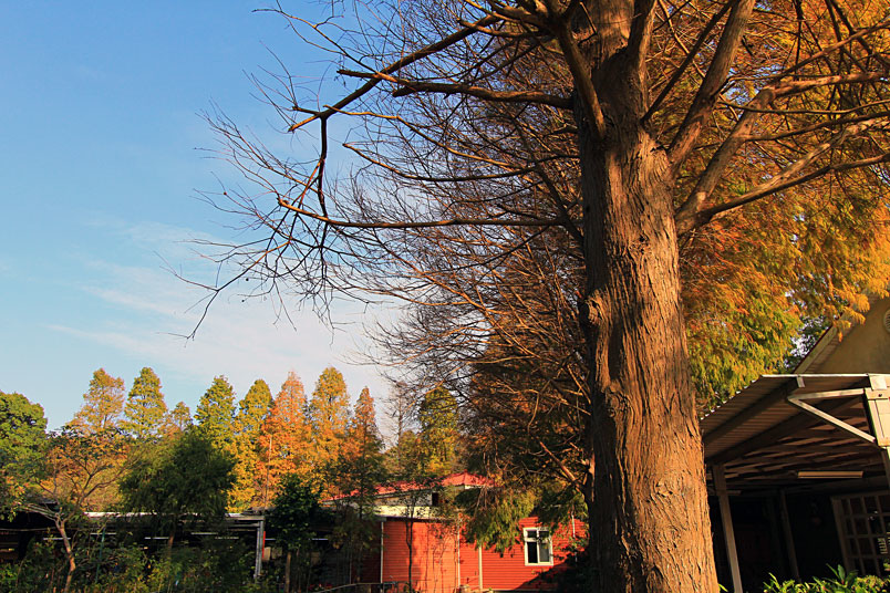 進入農場,就有順序整齊的落羽松成排而立,黃、紅相間的色彩