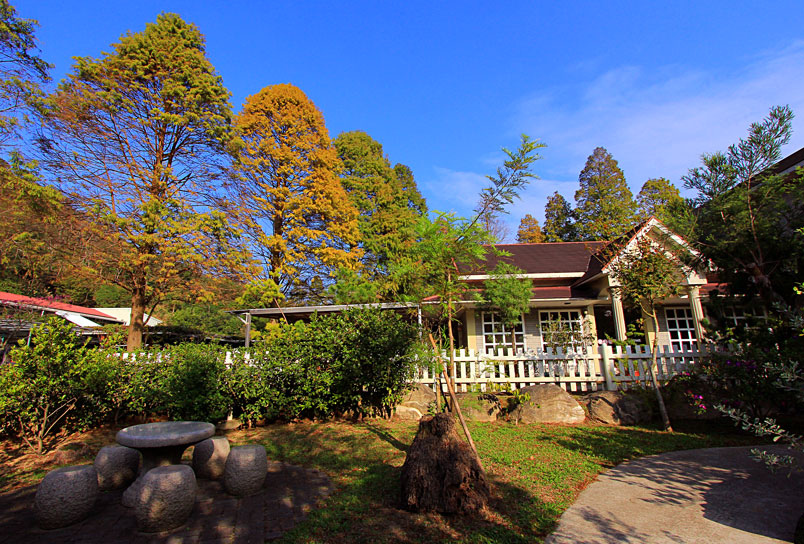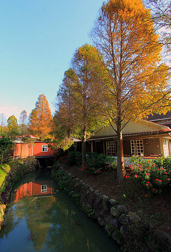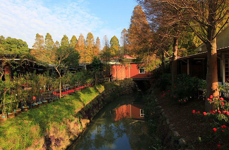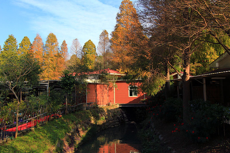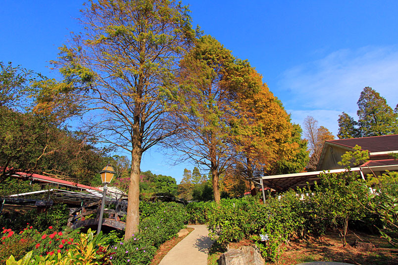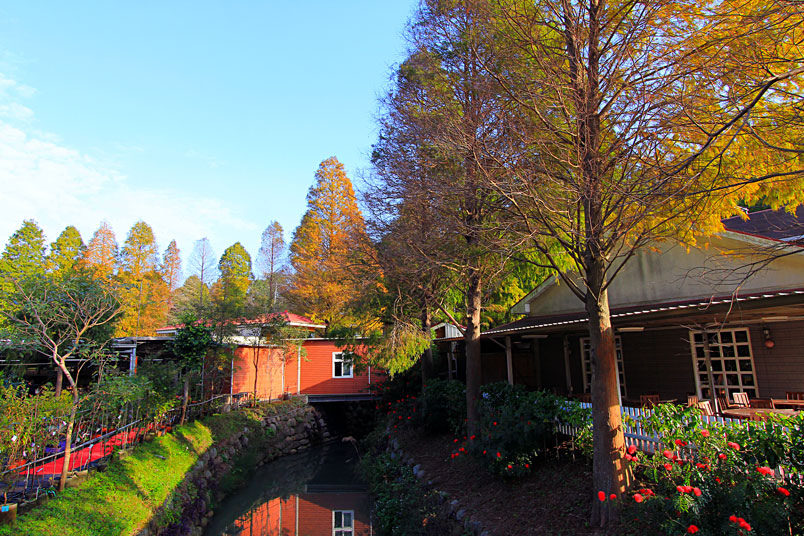 進入園中後,幾棟木構建築錯落在落羽松林中,一旁還有人工水