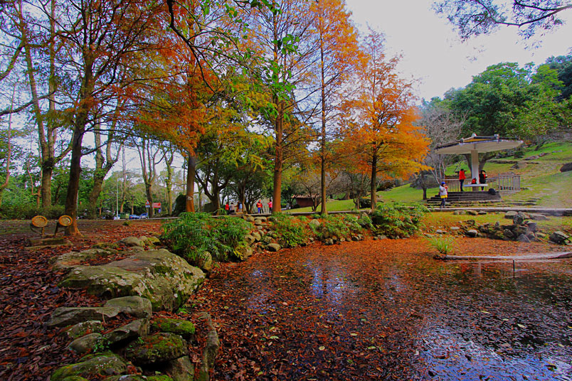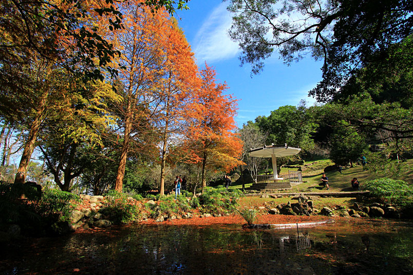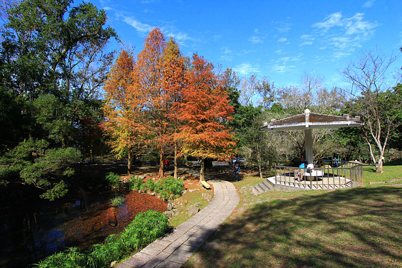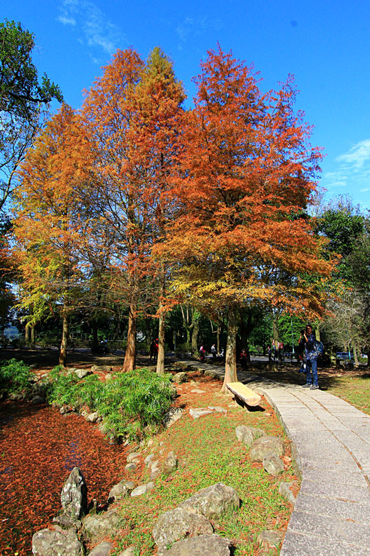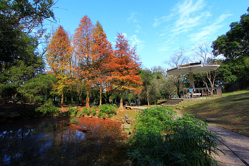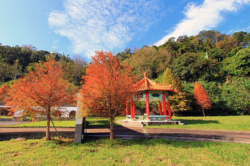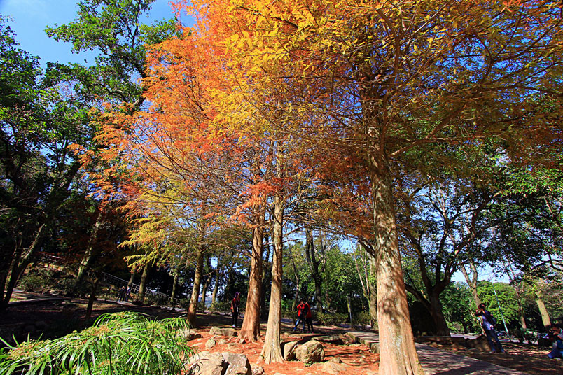 石門水庫除了楓紅,落羽松也披上紅紗,與楓紅爭艷,來石門水庫