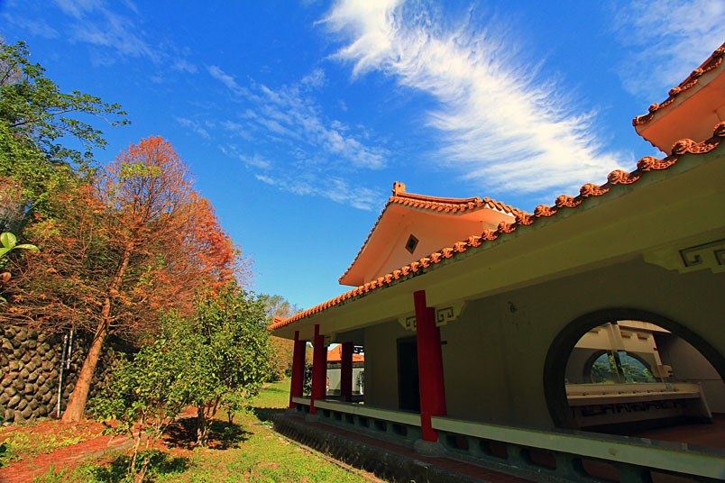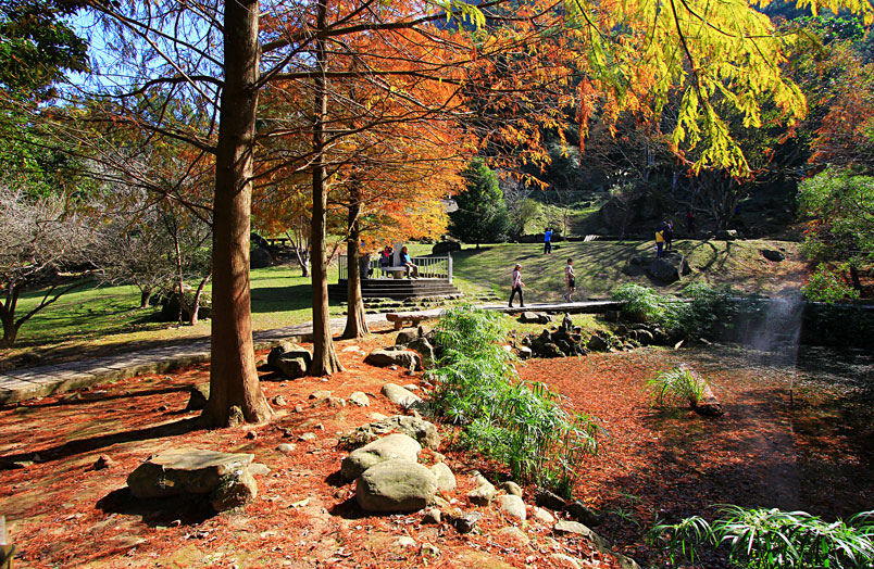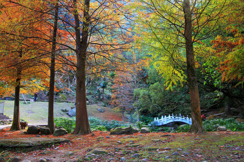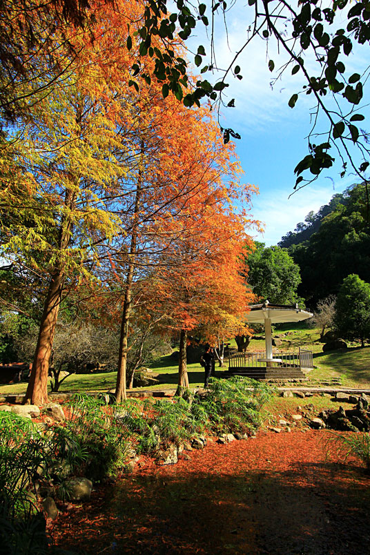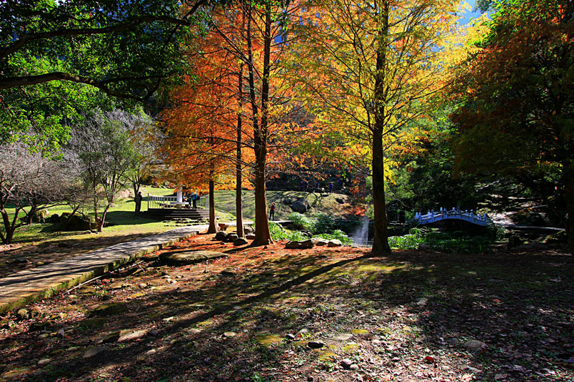 低海拔賞楓之地,冬季時節,放眼望去,金黃楓葉、雪白梅花,令