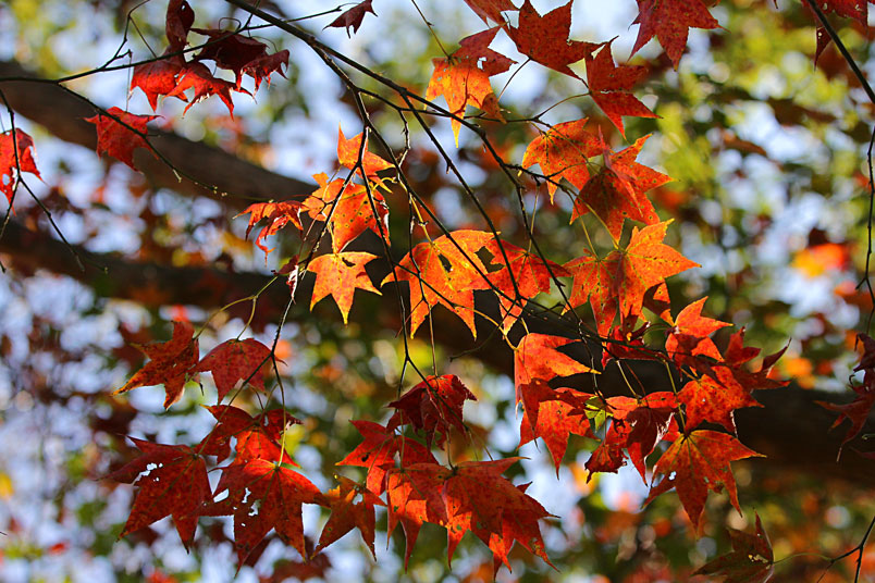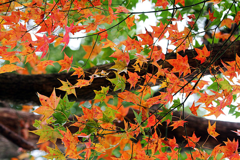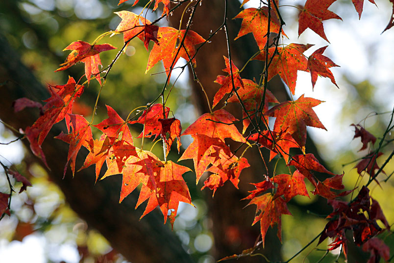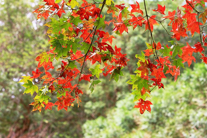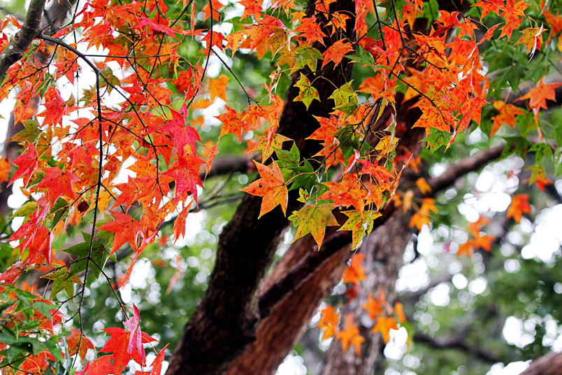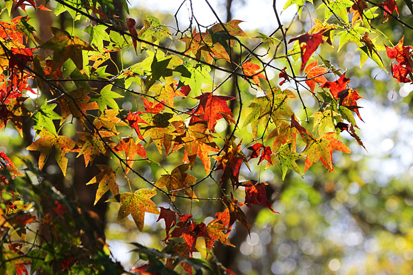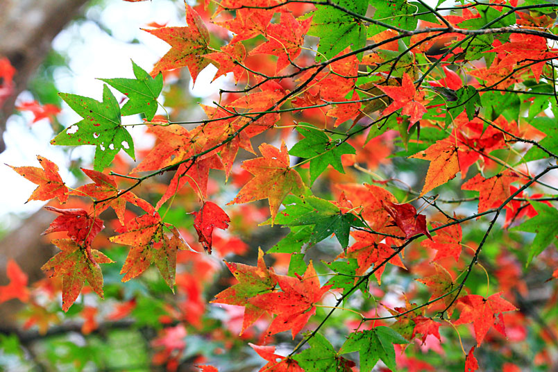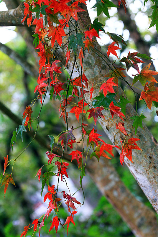 戰備隧道旁的幾棵楓樹,層層楓紅互相輝映,冬天的暖陽穿過楓葉