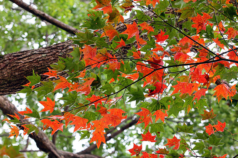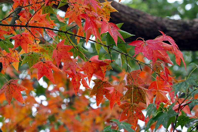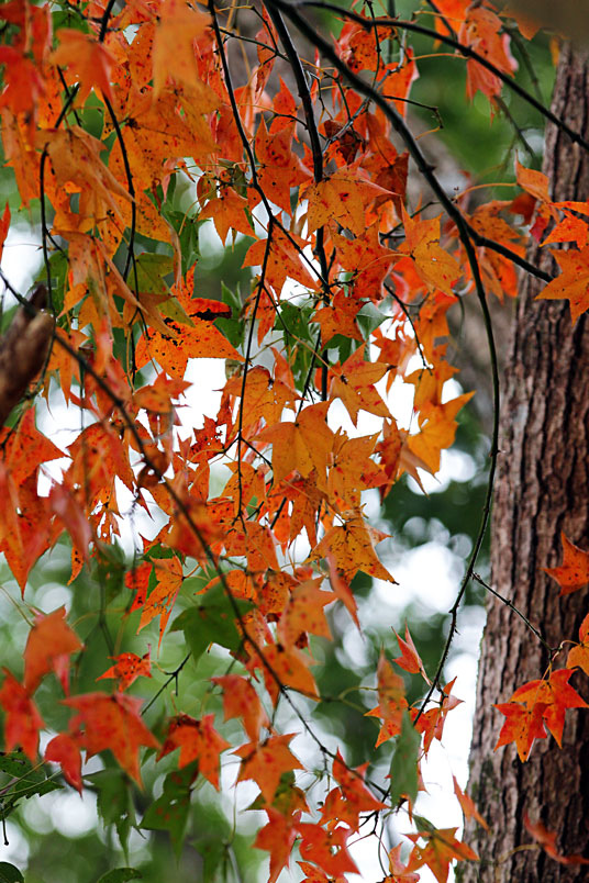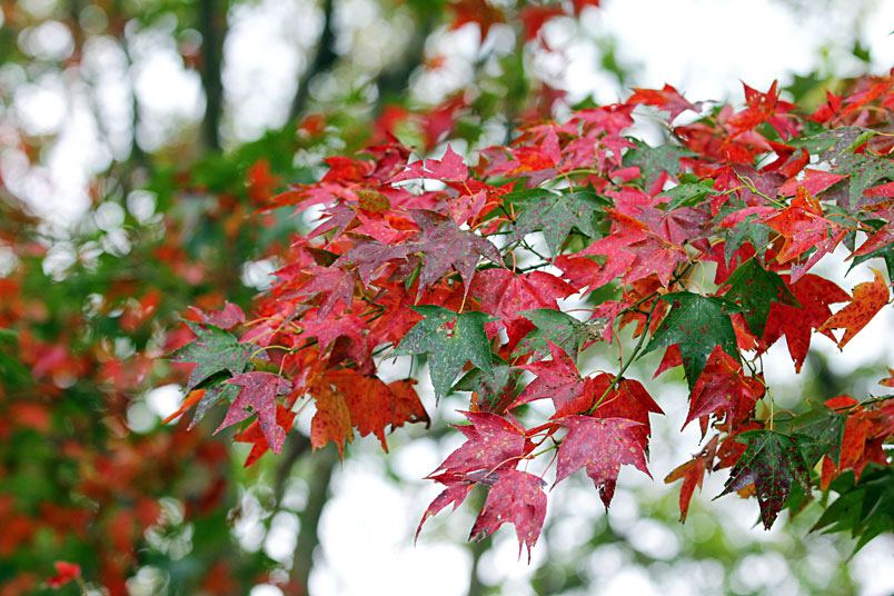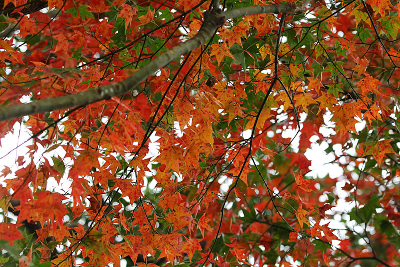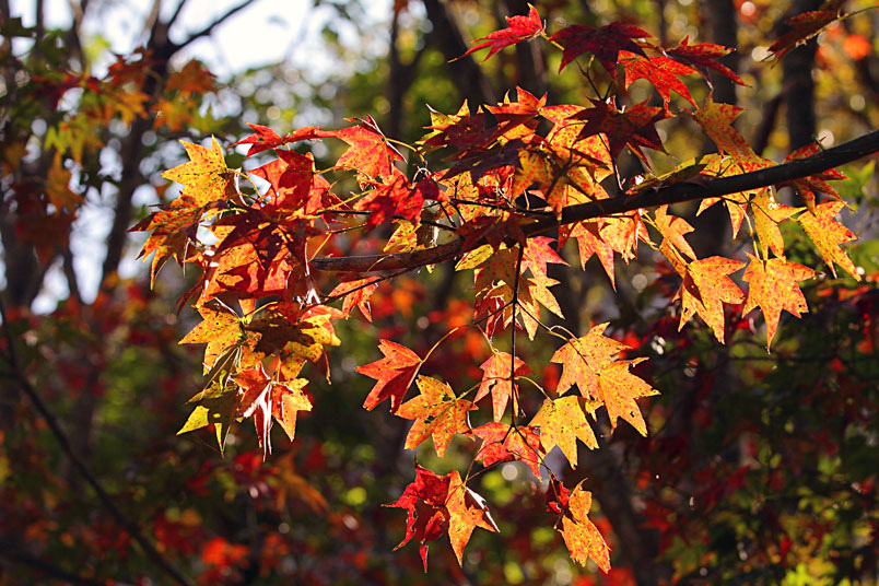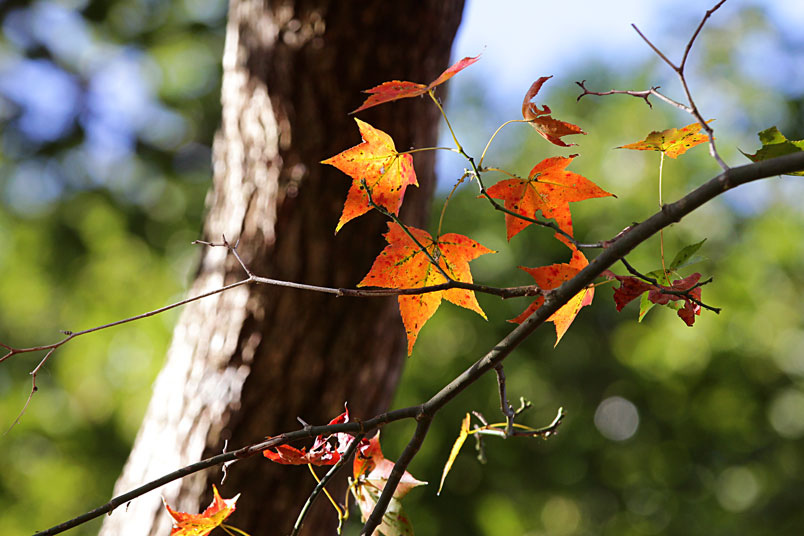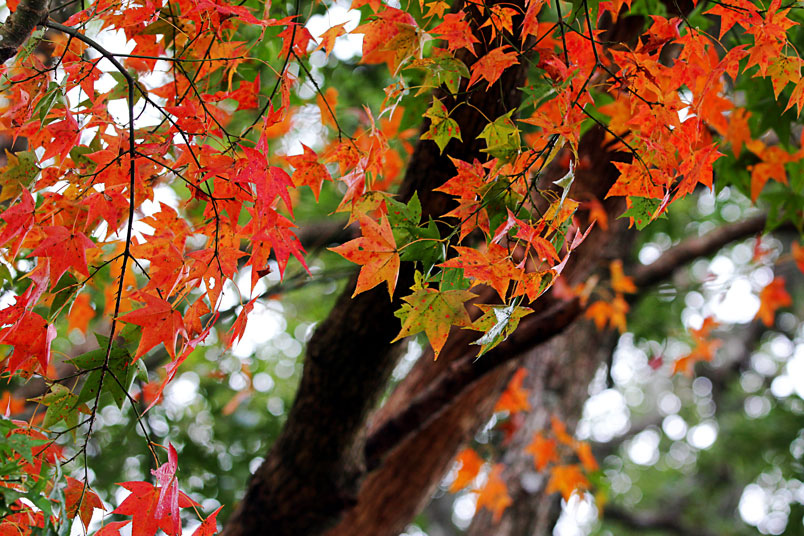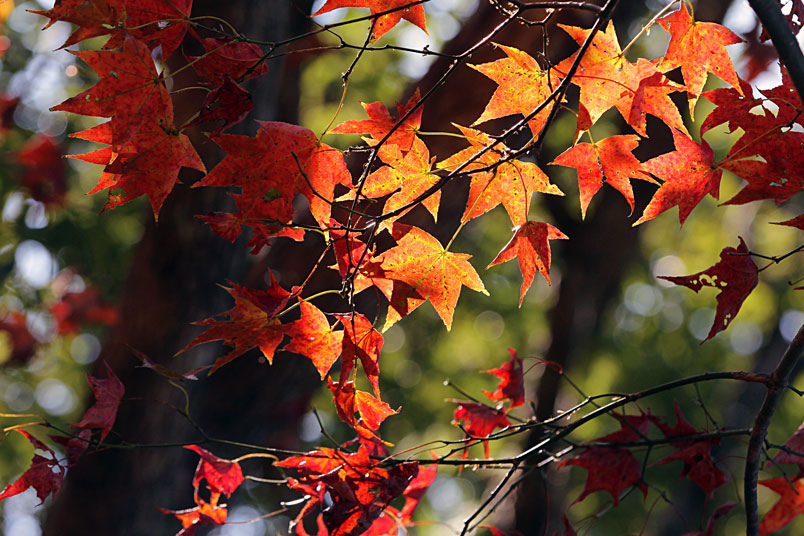 戰備隧道旁的幾棵楓樹,層層楓紅互相輝映,冬天的暖陽穿過楓葉