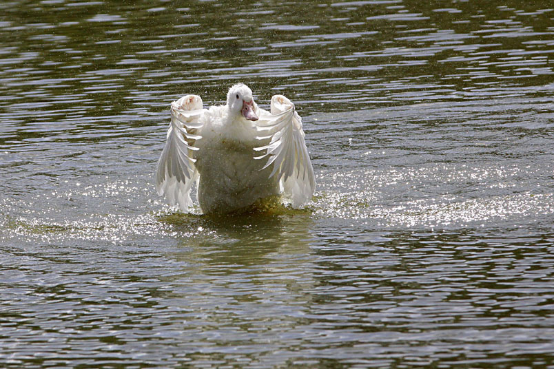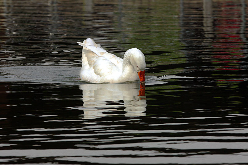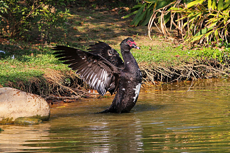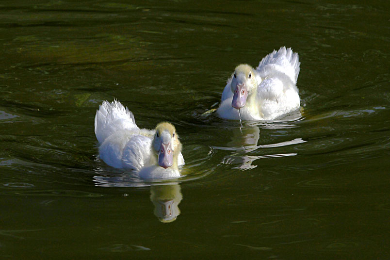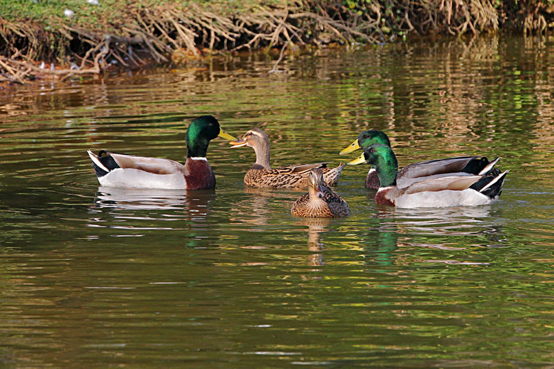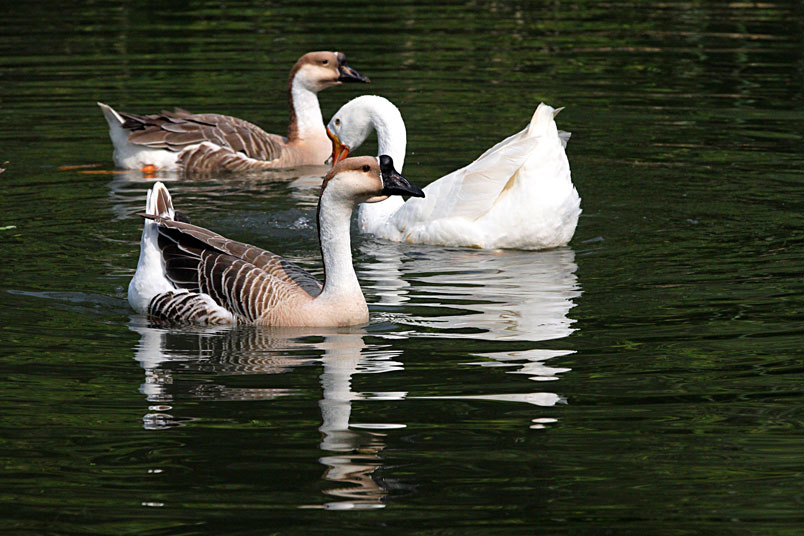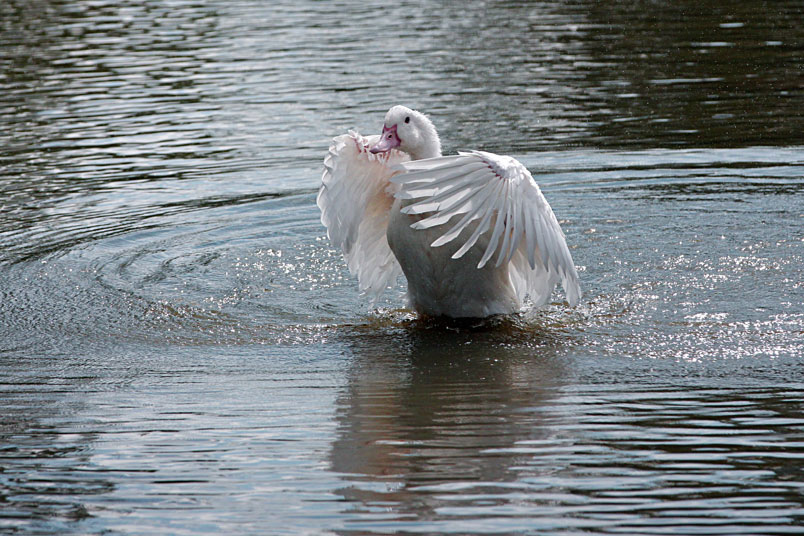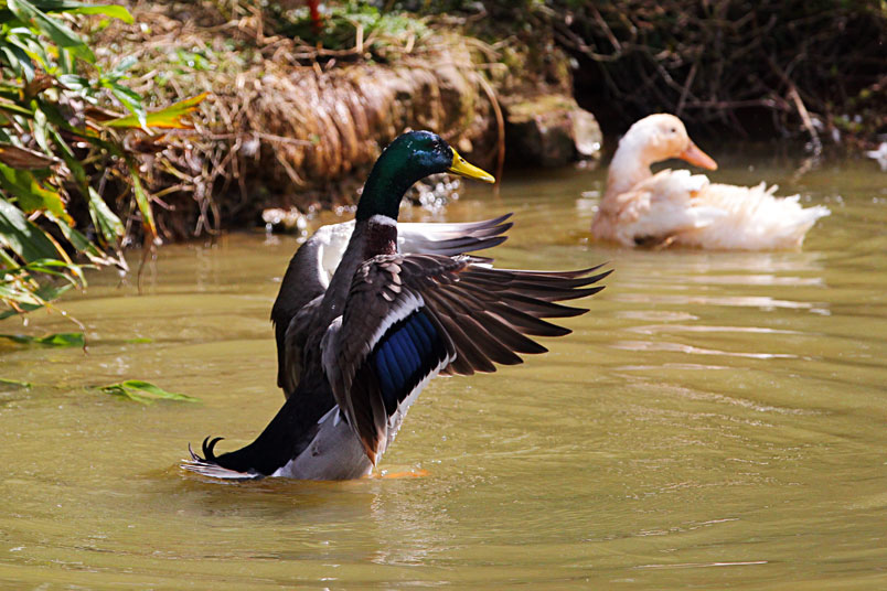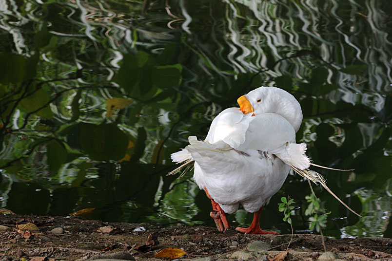 池塘邊,有三五成群的鴨子在冰冷的水中戲游,時而把頭潛入水