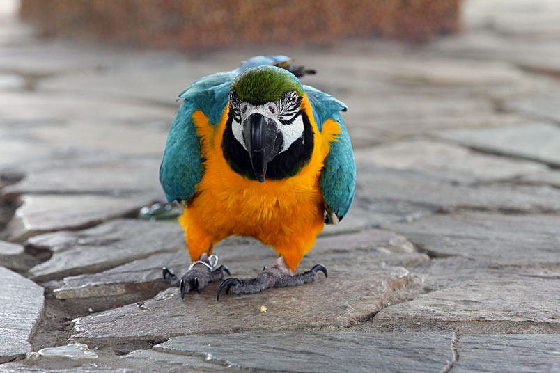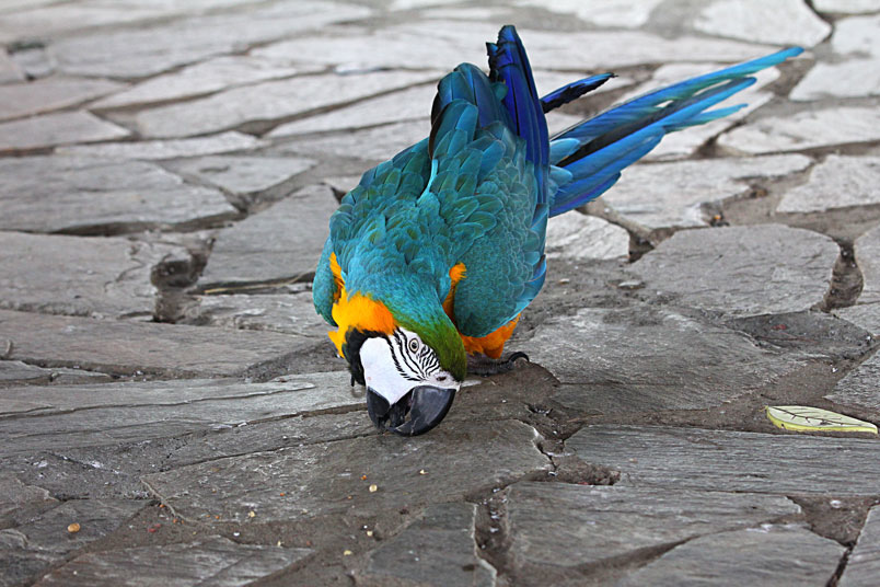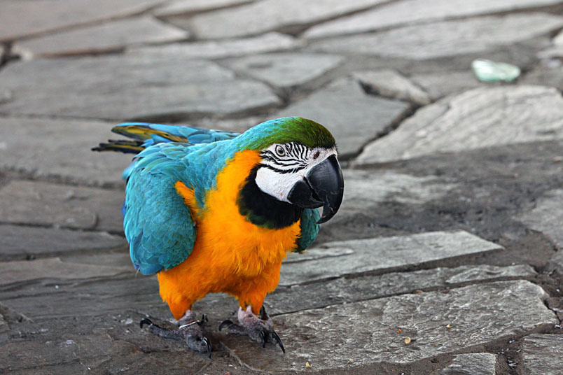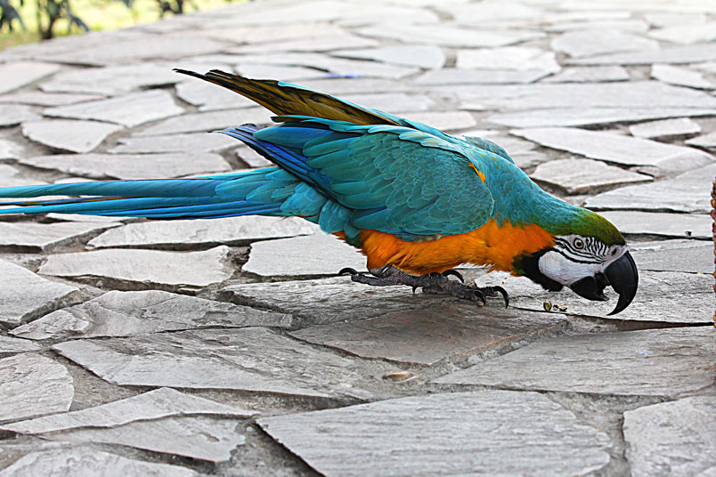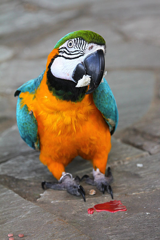 體長約86cm,是最常見的金剛鸚鵡,牠愛親近人的特質使得這種