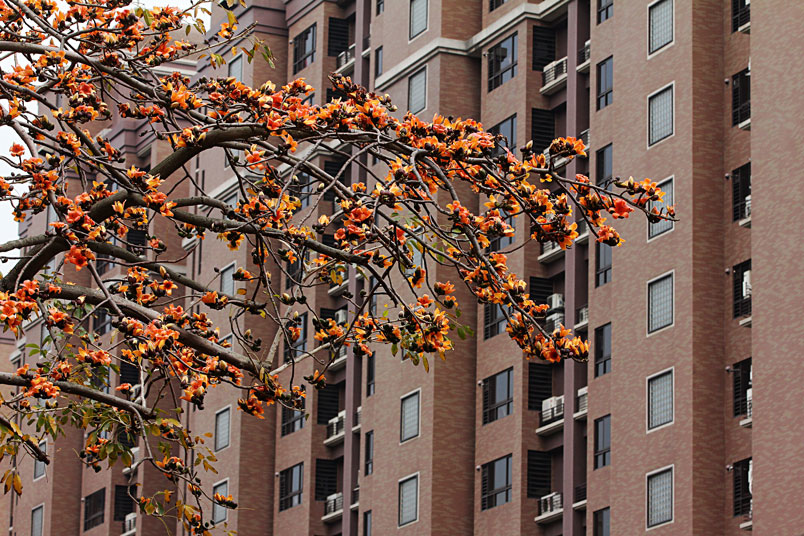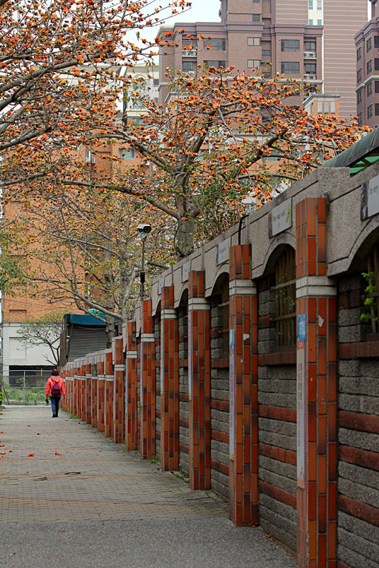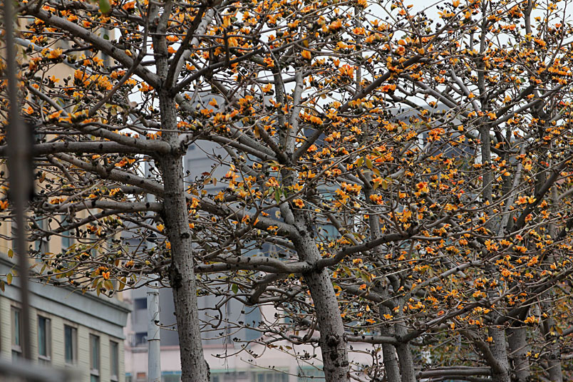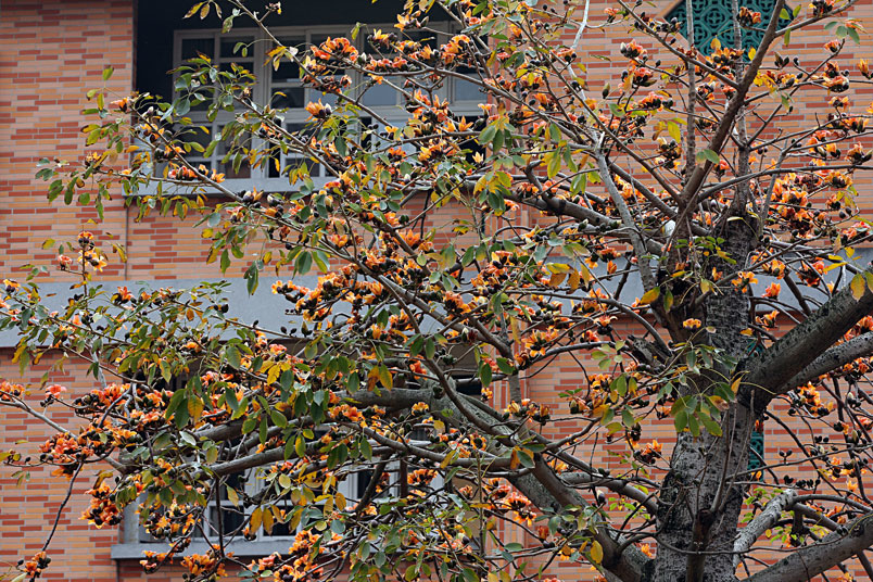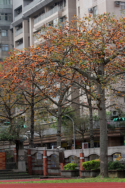 高挺的樹形,水平伸展的樹枝,樹枝上開滿 橙紅的花朵。不時,