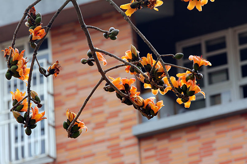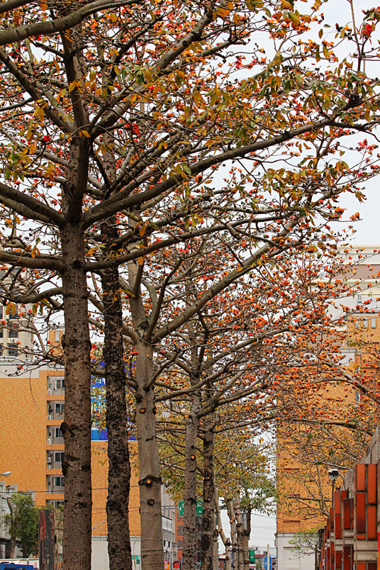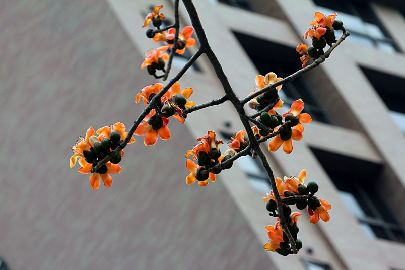 是朱紅色的木棉花盛開時,遠觀時還以為一把一把的烽火插在山