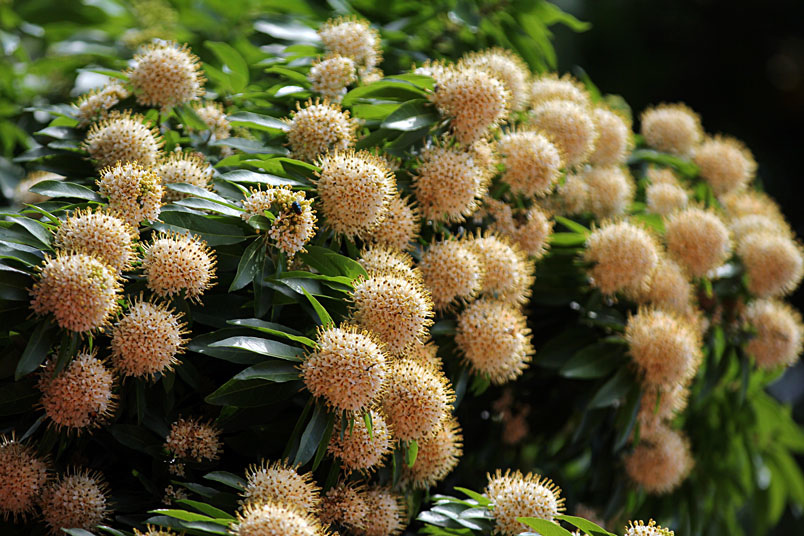 花團緊密包住般,而放射狀的潔白花朵一段時間後會轉為黃色,