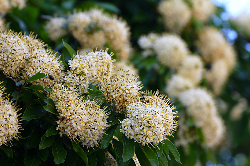 花繖房花序圓錐狀,頂生,花萼鐘形5裂,外被星狀毛,花瓣5片,