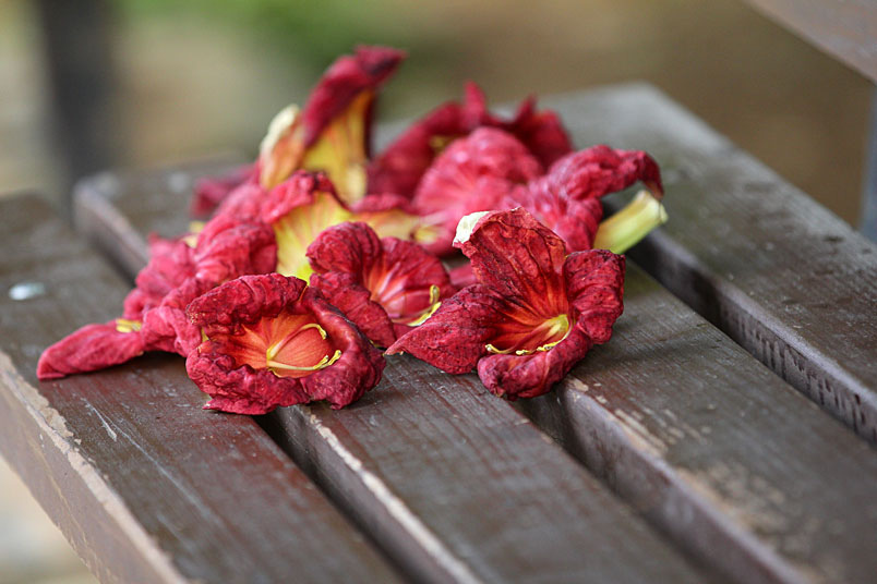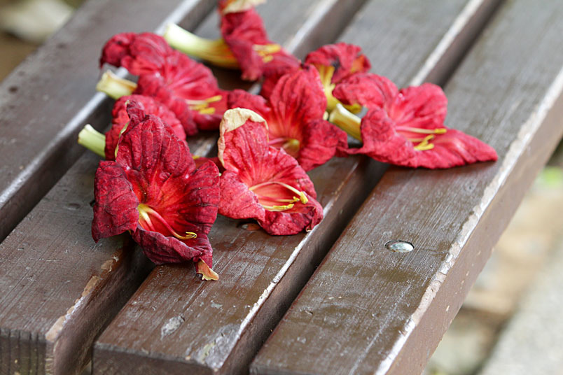 細長花絲,有點像假花;臘腸樹花通常在夜晚盛開,清晨凋謝飄