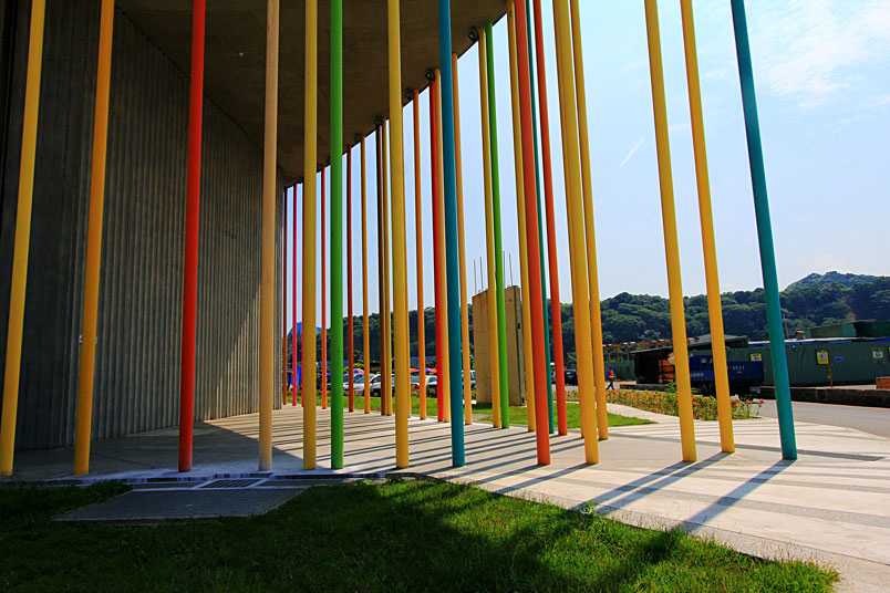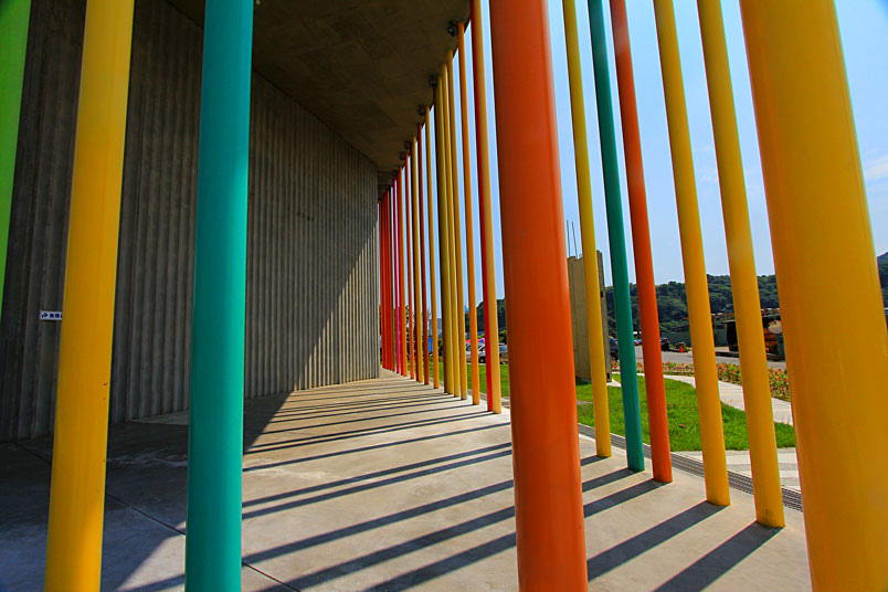 面的走廊,用160支、52色的彩色高柱打造,配合曲線屋脊,遠看