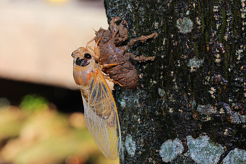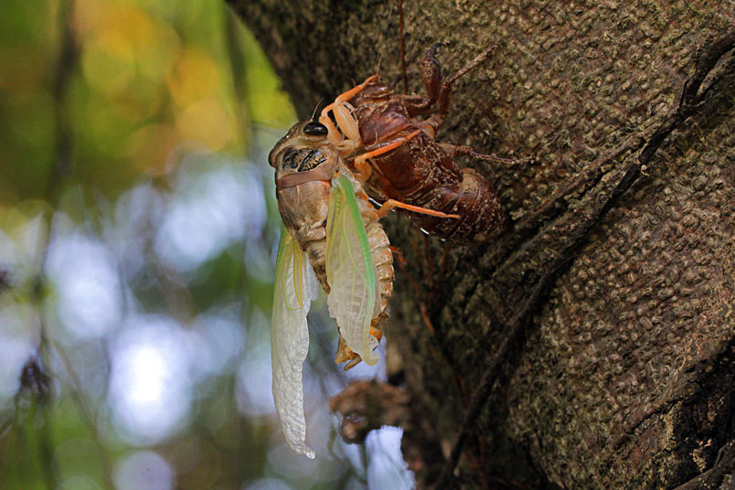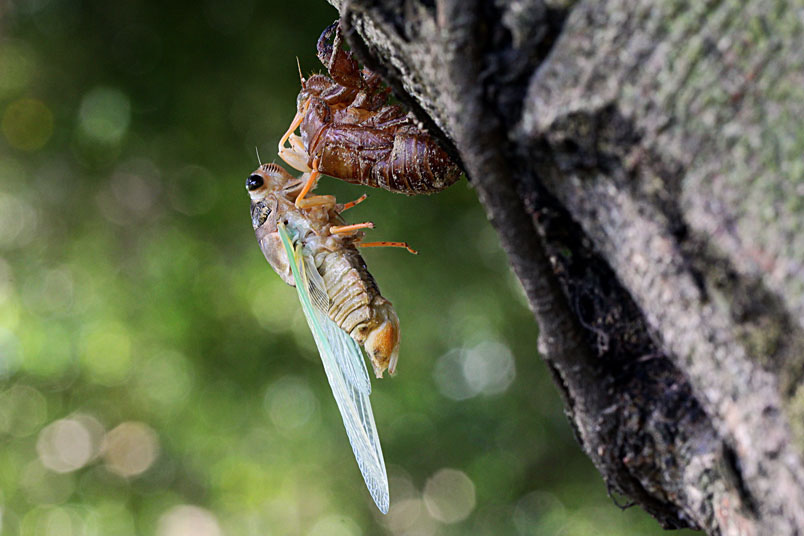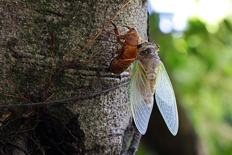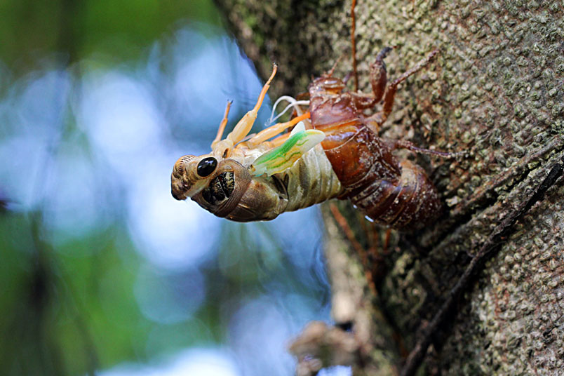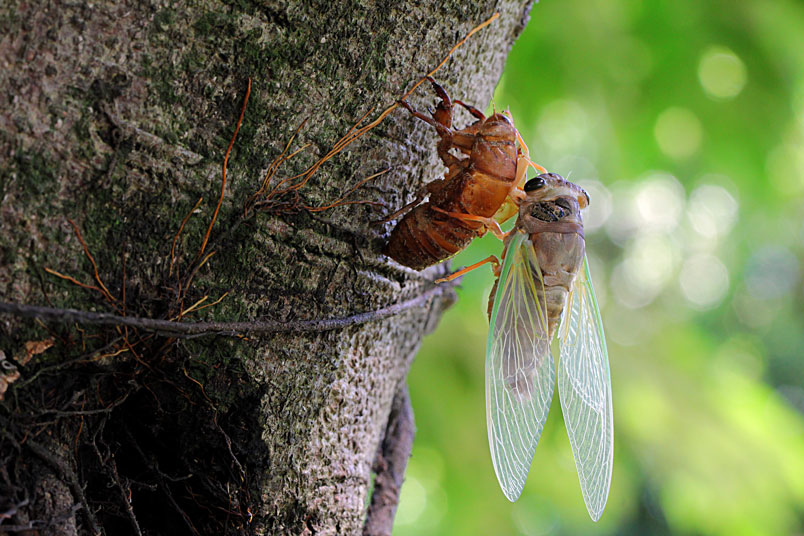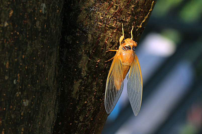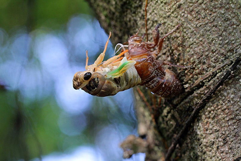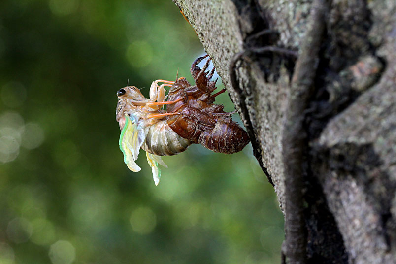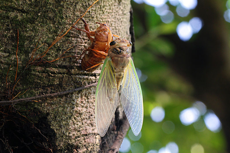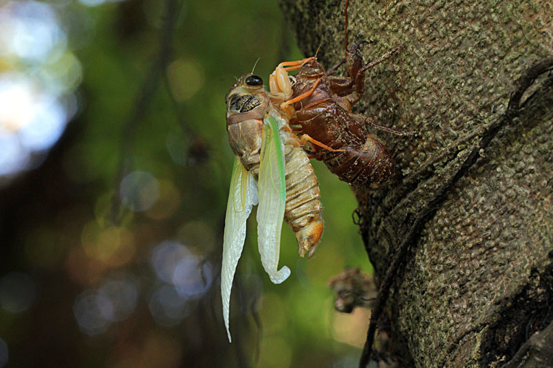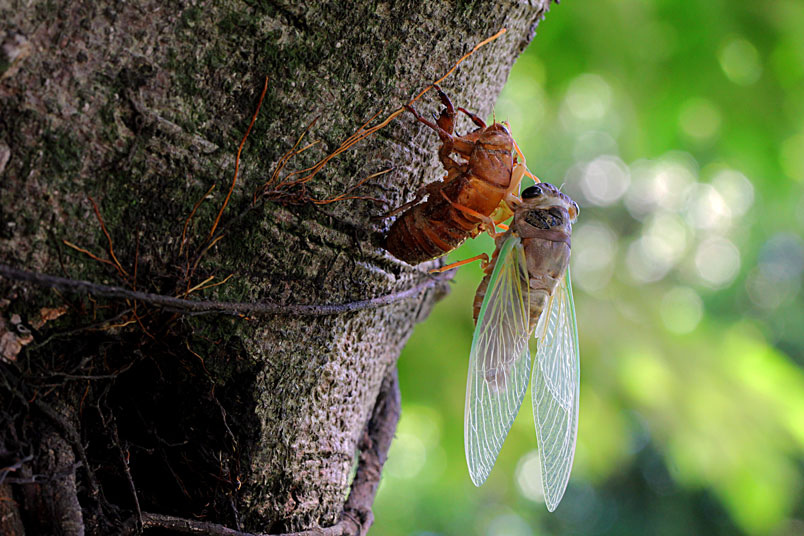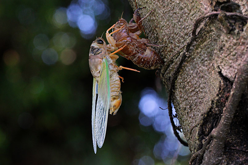 成功羽化的熊蟬伴隨著黎明曙光翩然飛行,為著繁衍後代忙碌去了