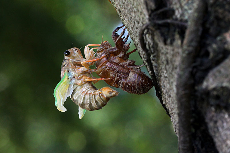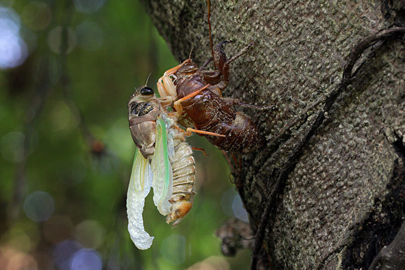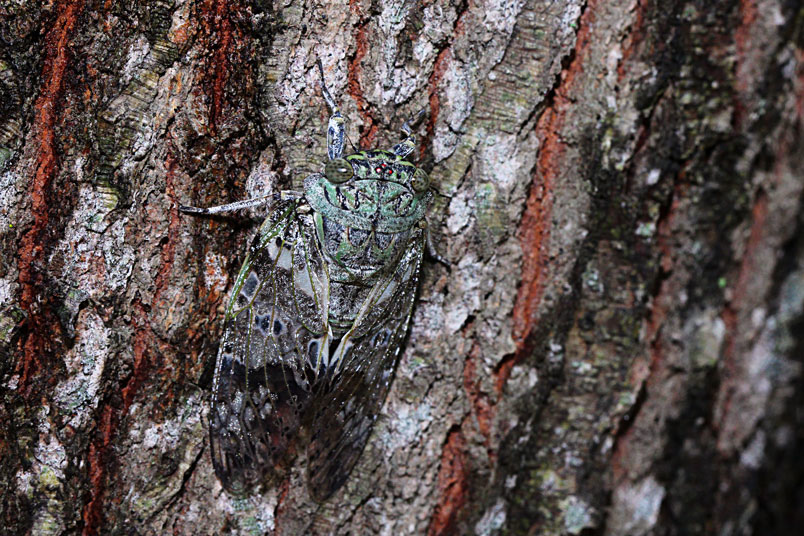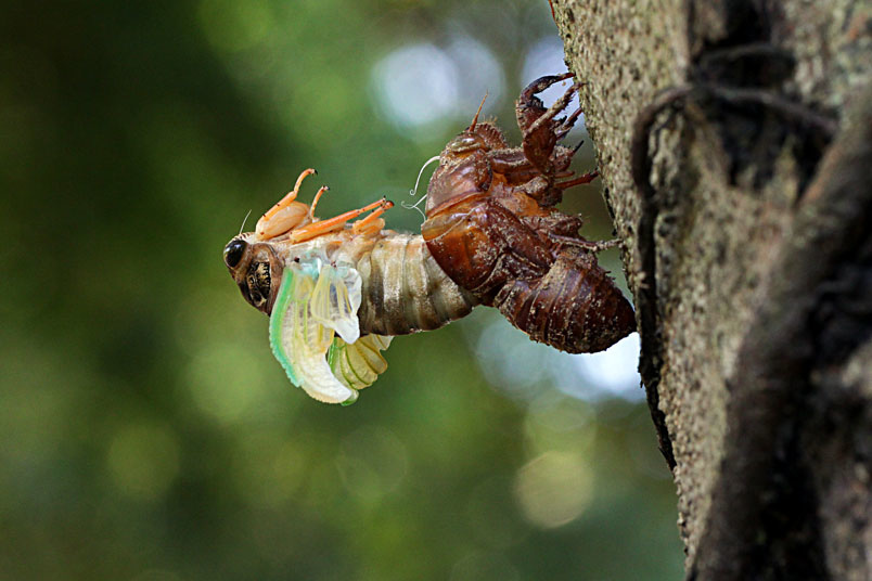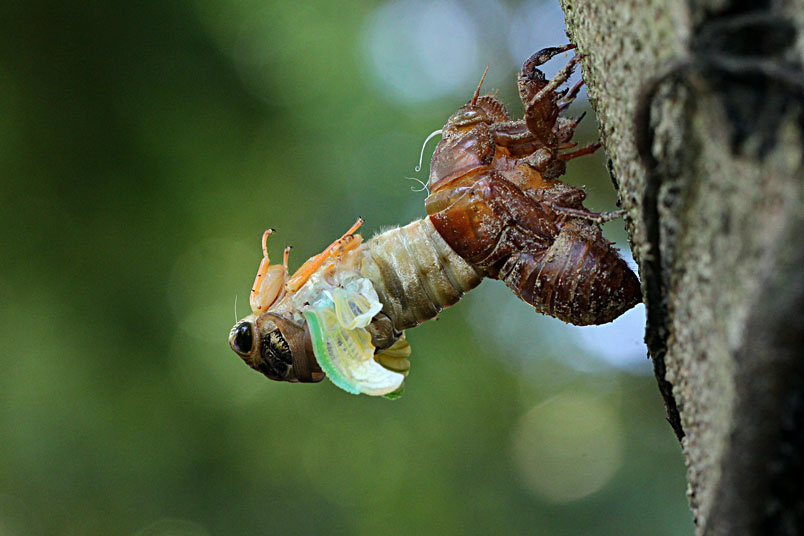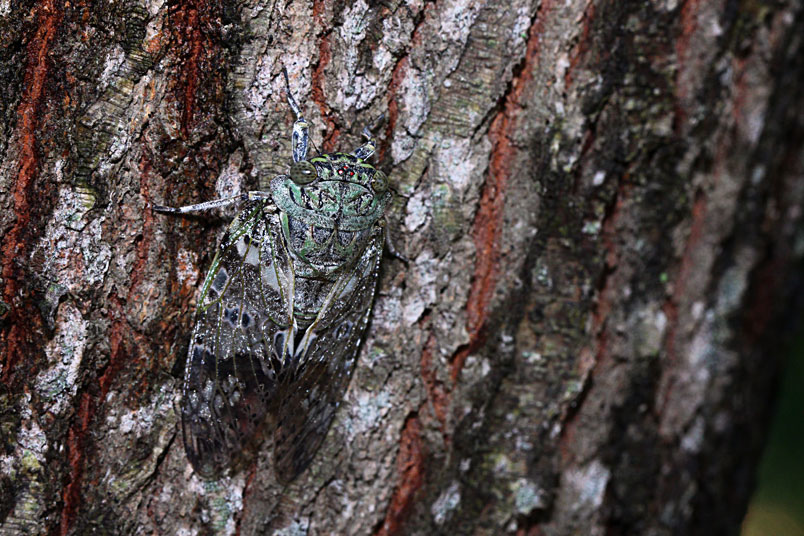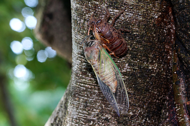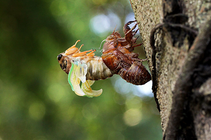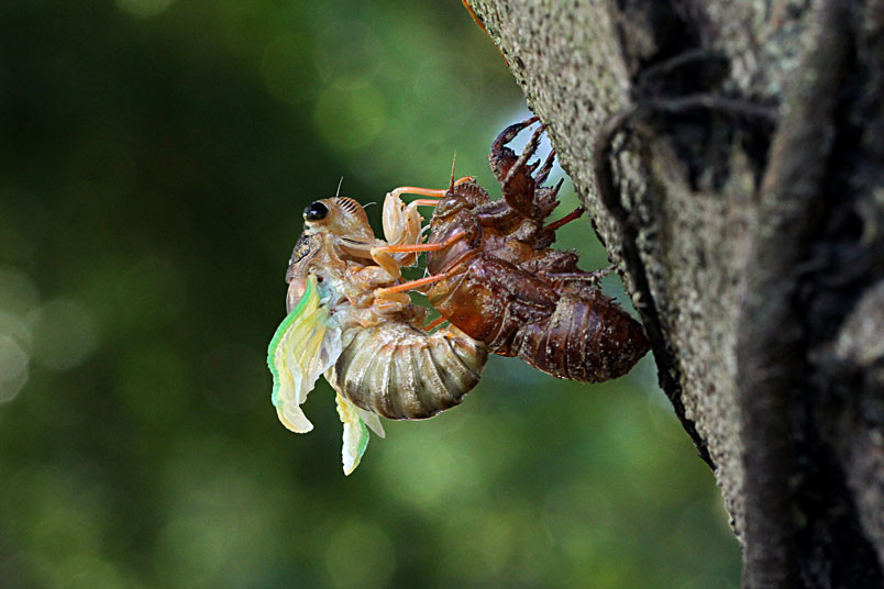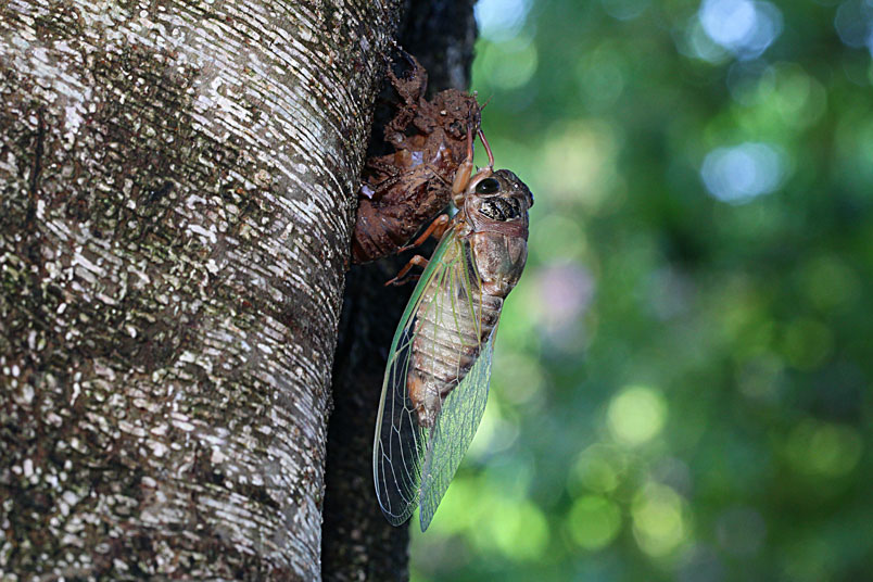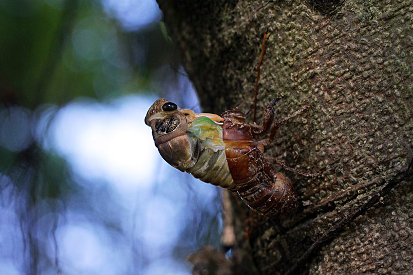 紅脈熊蟬,若蟲在地下吸食樹根汁液長大,4年多後在夏夜裡,鑽出