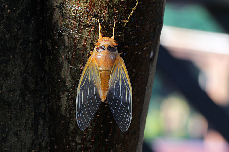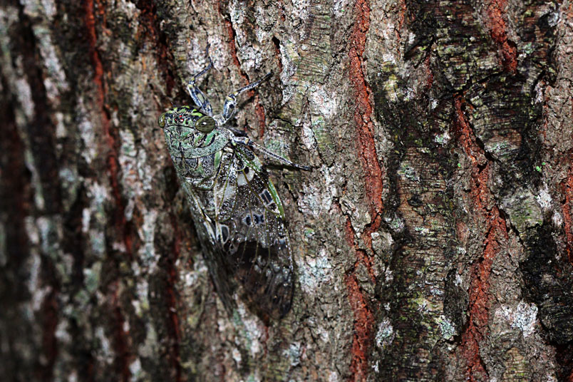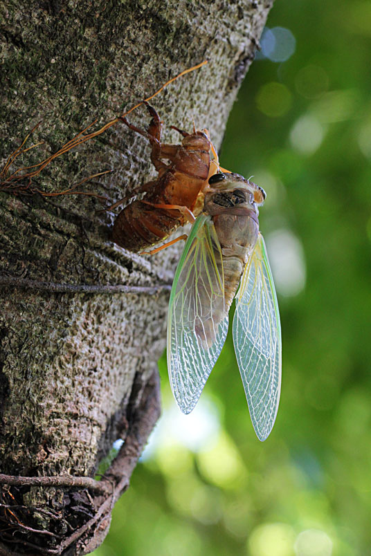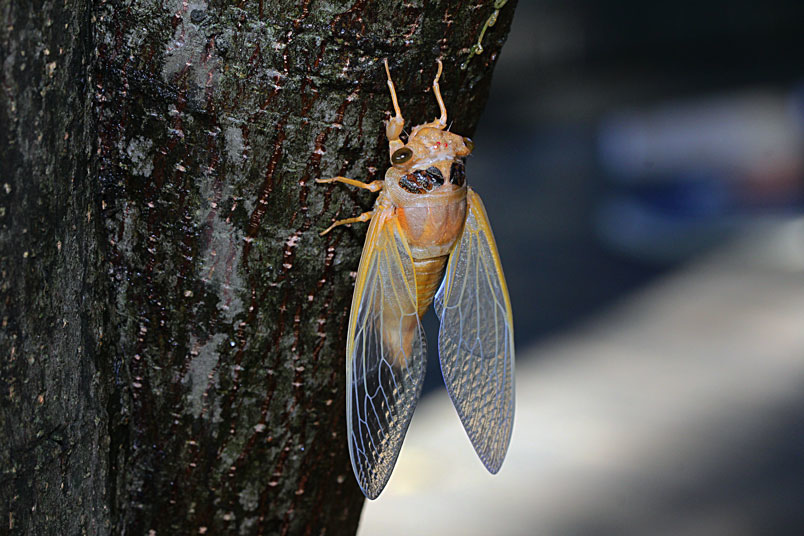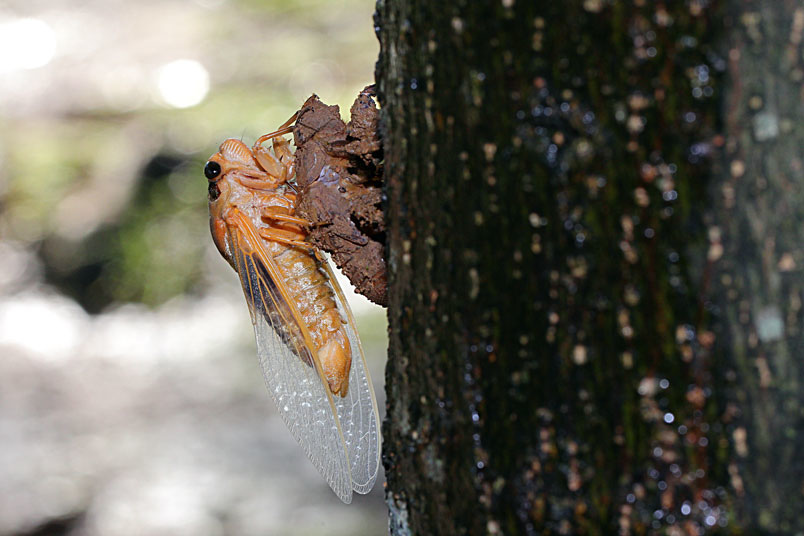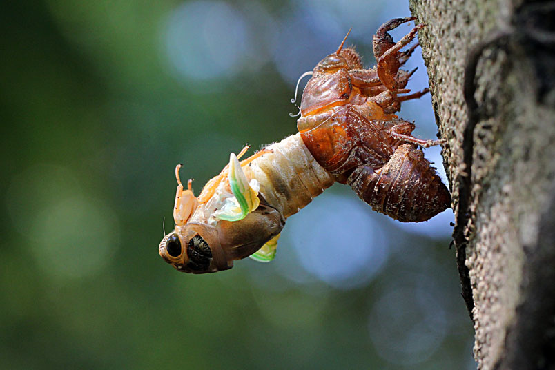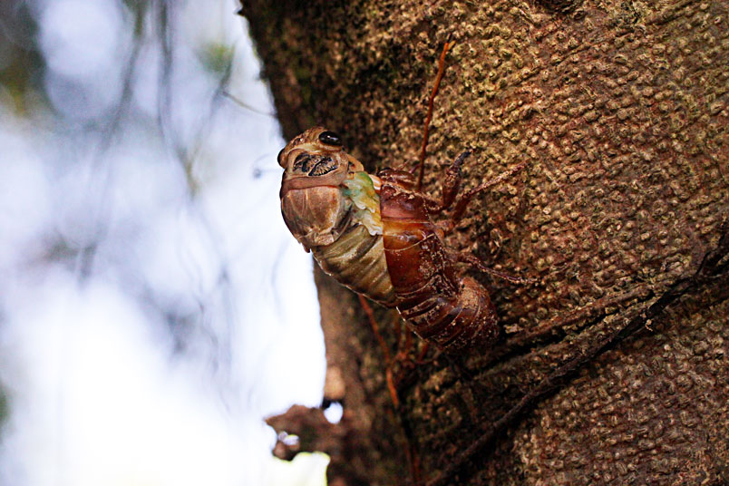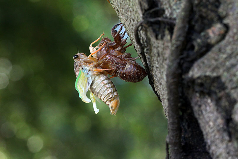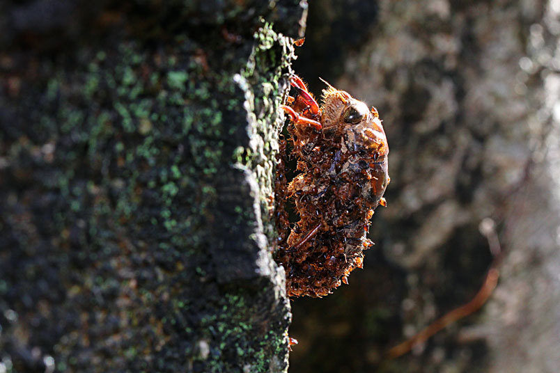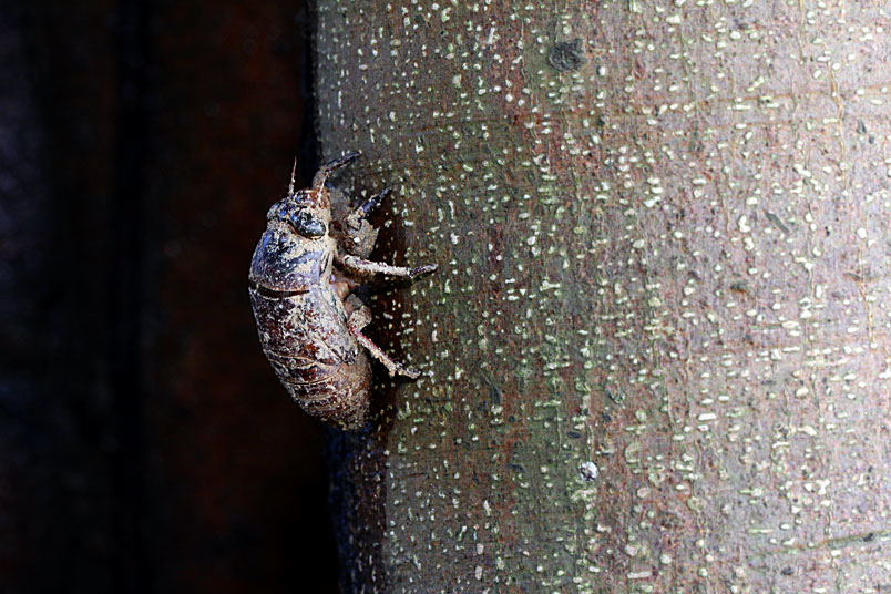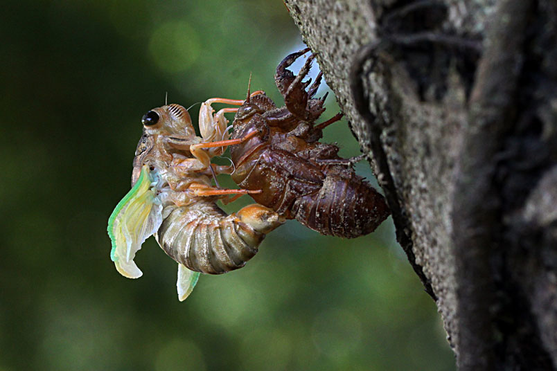 紅脈熊蟬,若蟲在地下吸食樹根汁液長大,4年多後在夏夜裡,鑽出