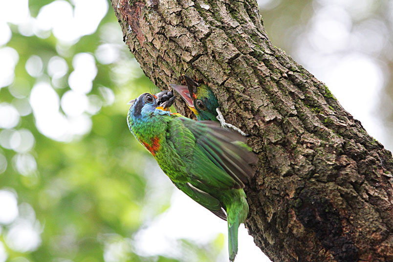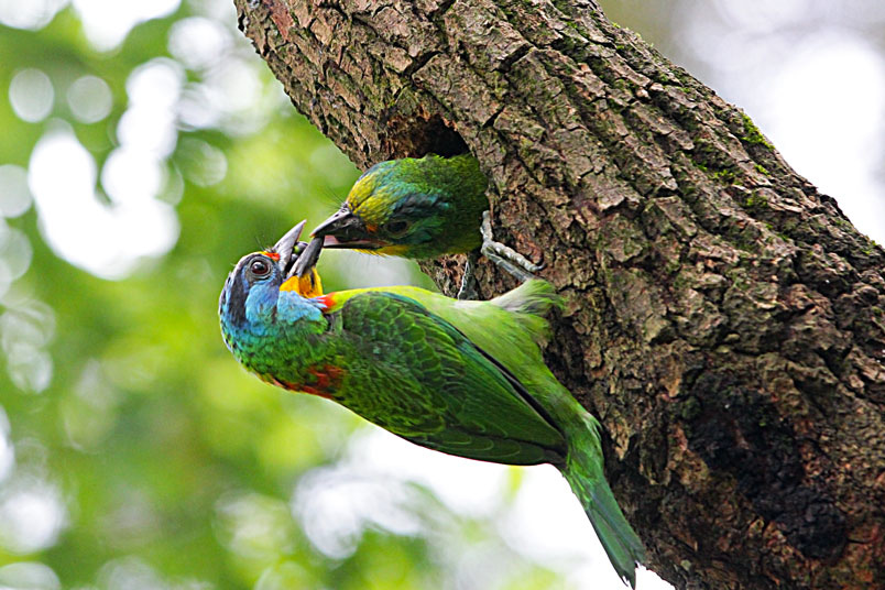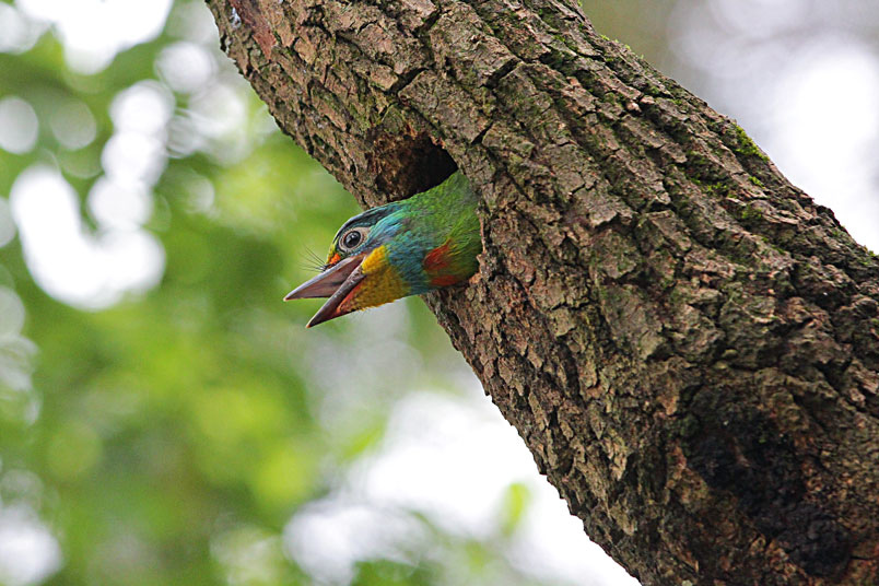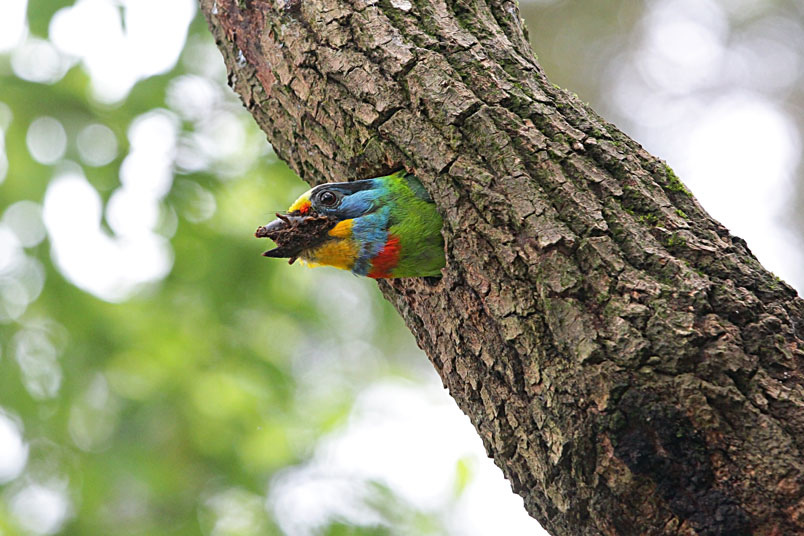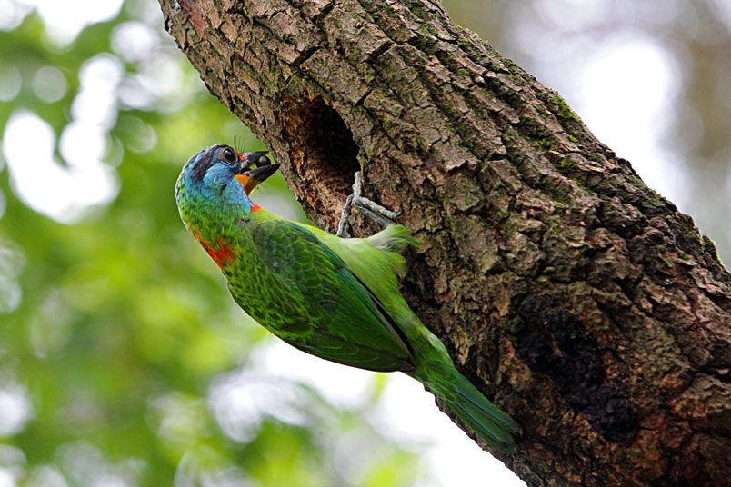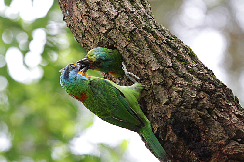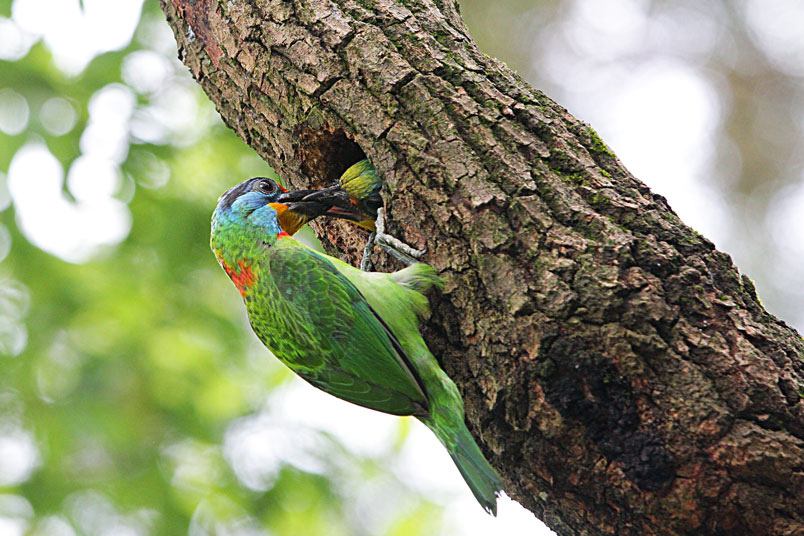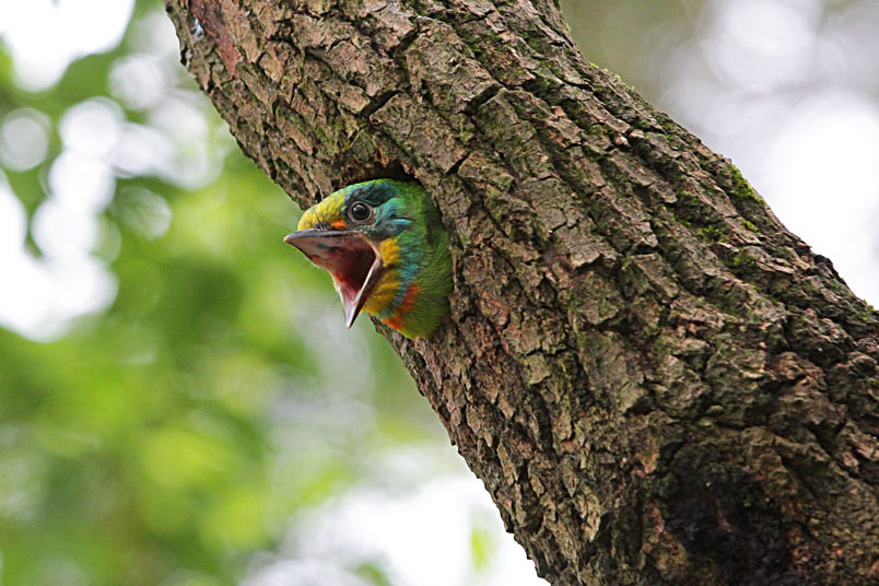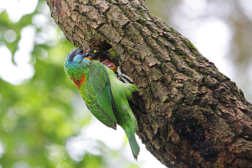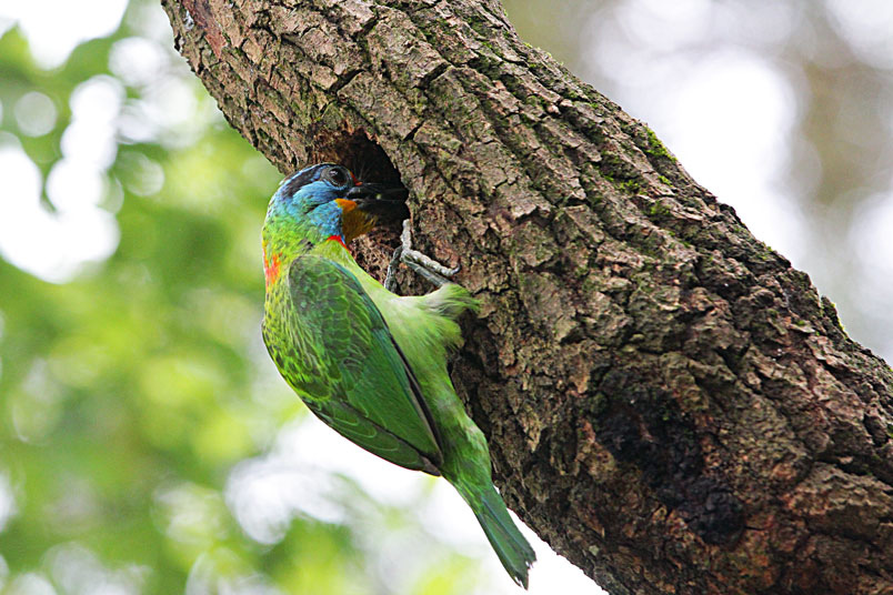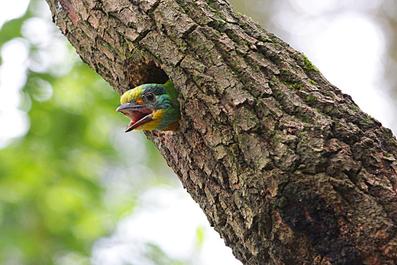 五色鳥的繁殖期自3月約至9月,在春天的公園裡可見到他們在枯枝