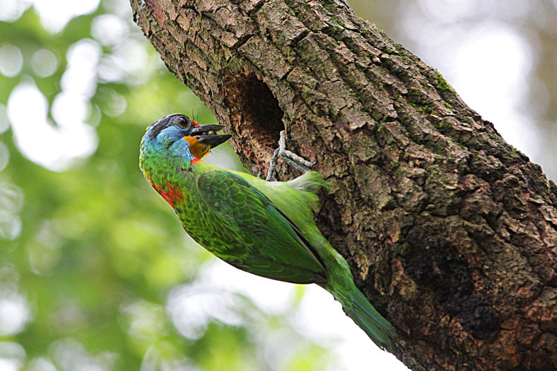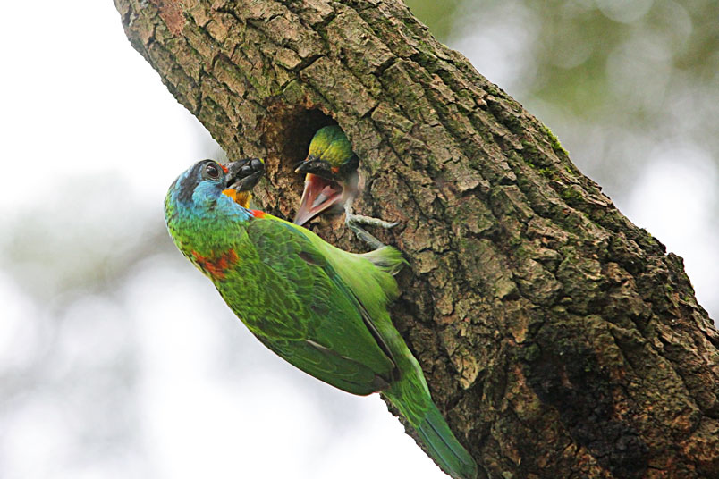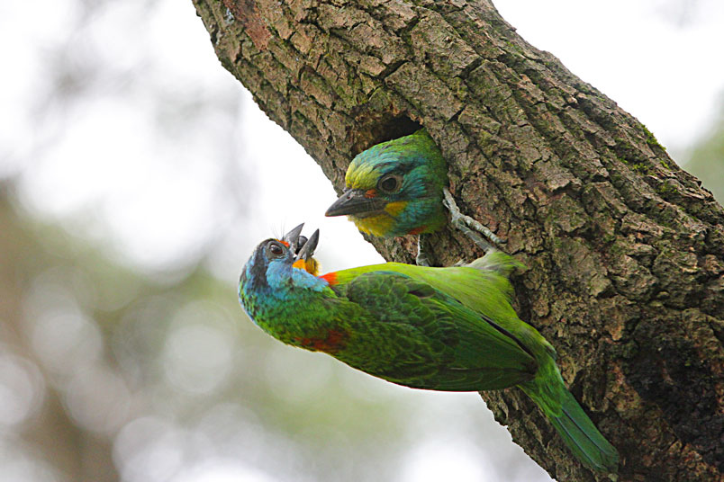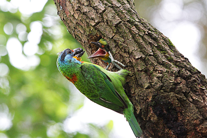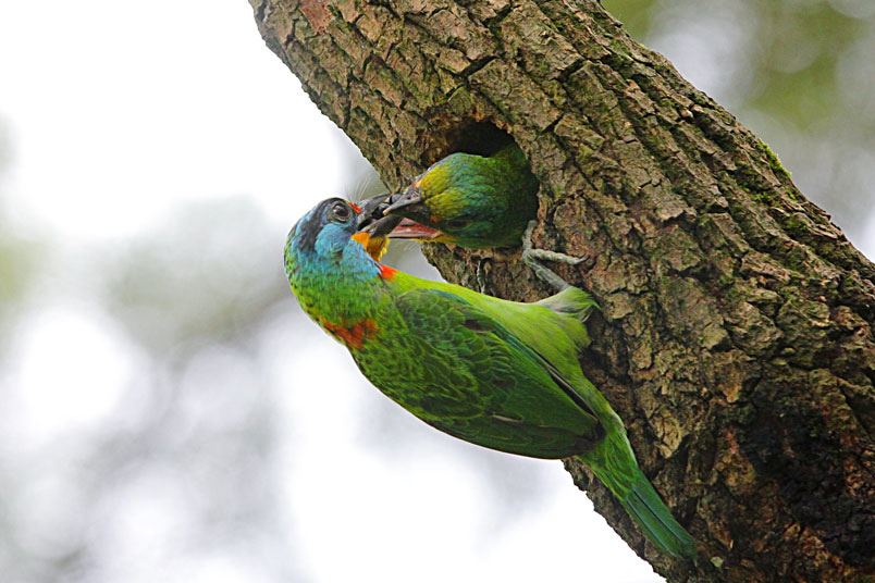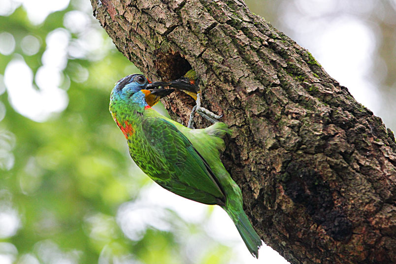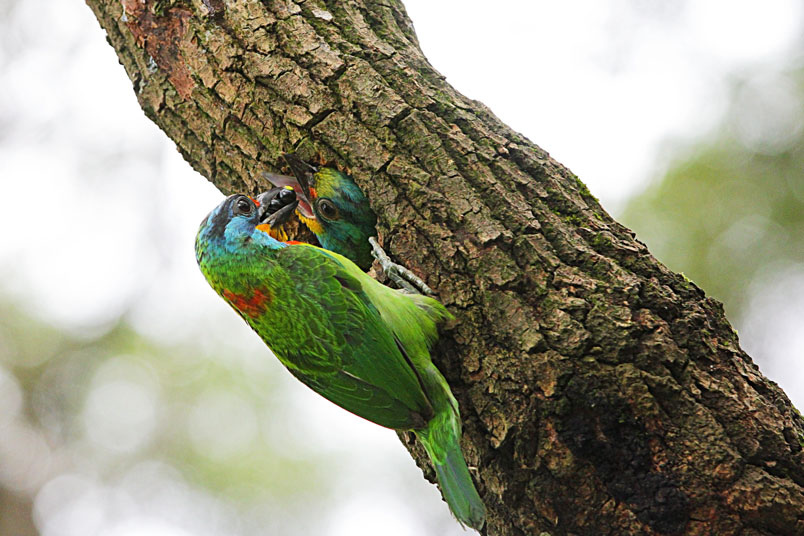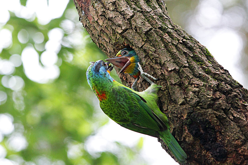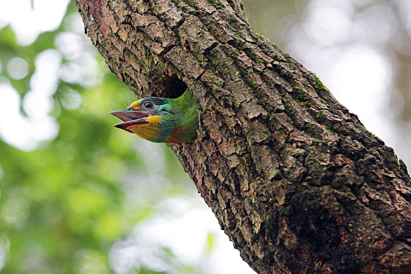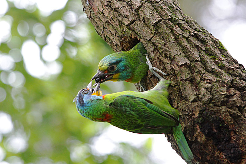 五色鳥的繁殖期自3月約至9月,在春天的公園裡可見到他們在枯枝