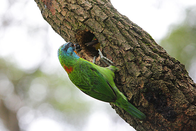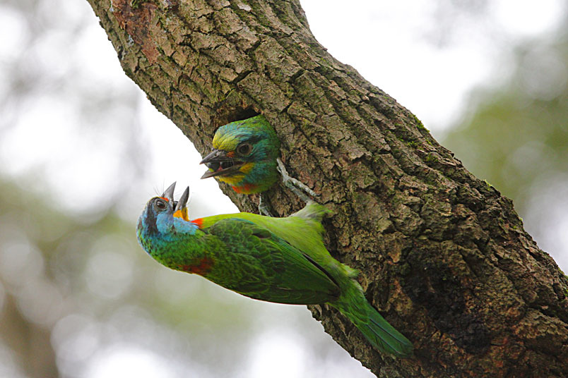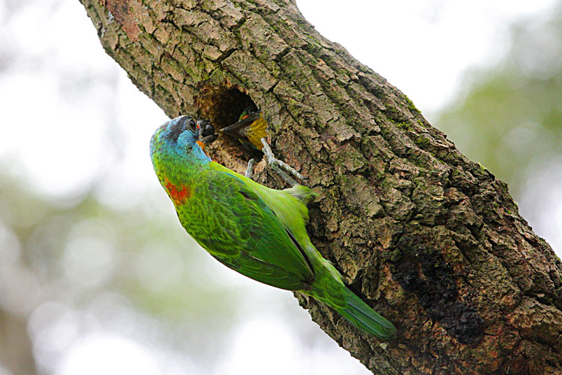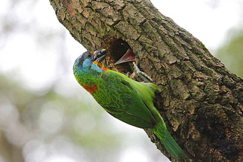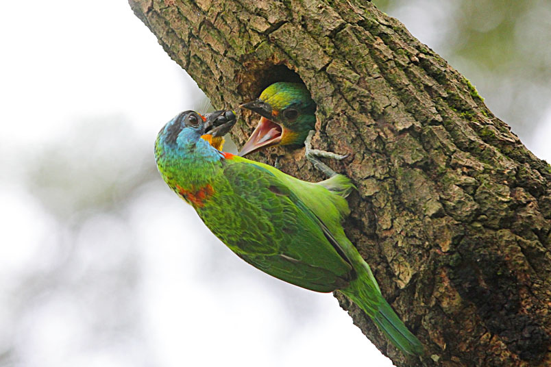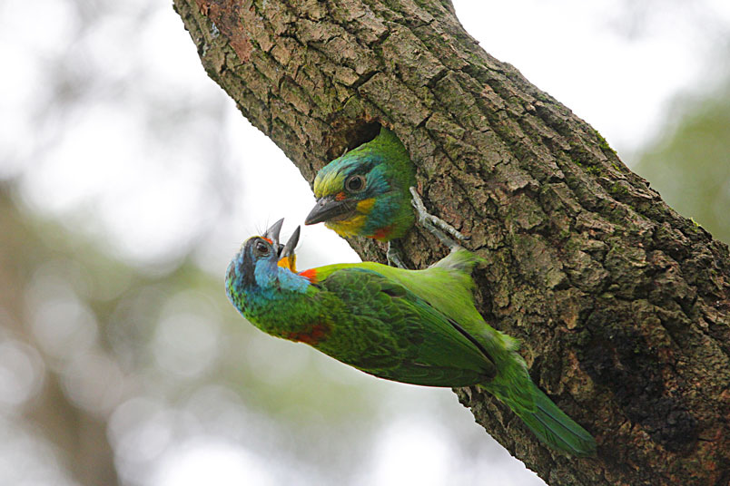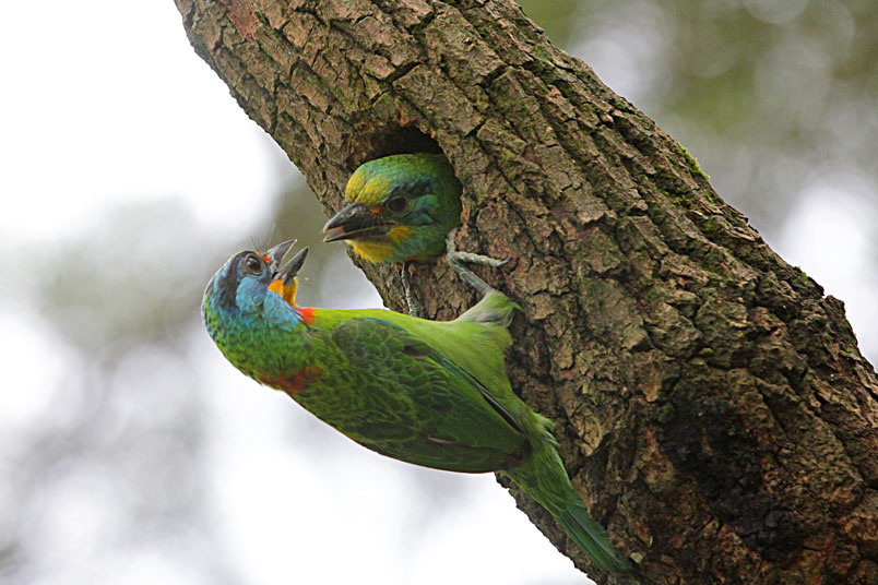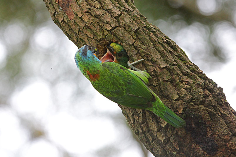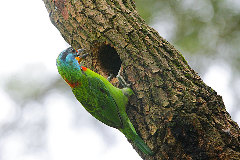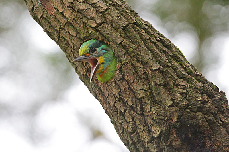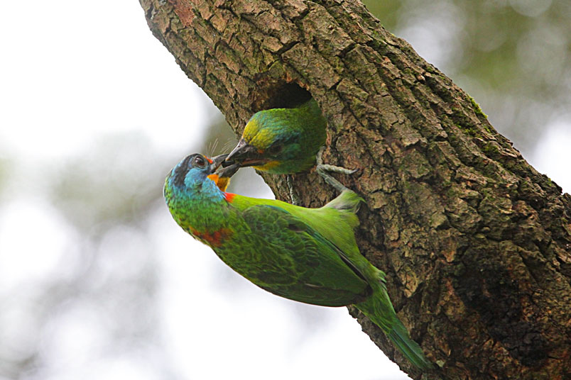 五色鳥的繁殖期自3月約至9月,在春天的公園裡可見到他們在枯枝