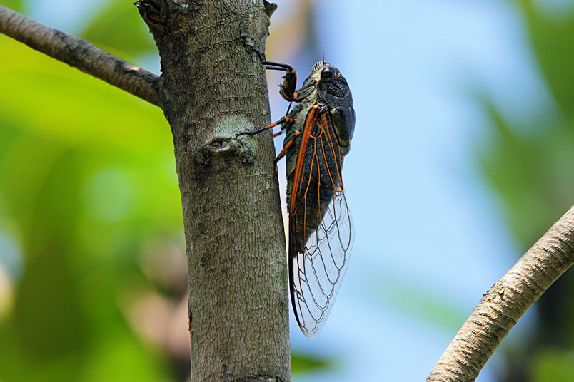 翅膀外緣有紅色細脈分布,屬台灣特有種大型蟬,幼蟲在地下生活約