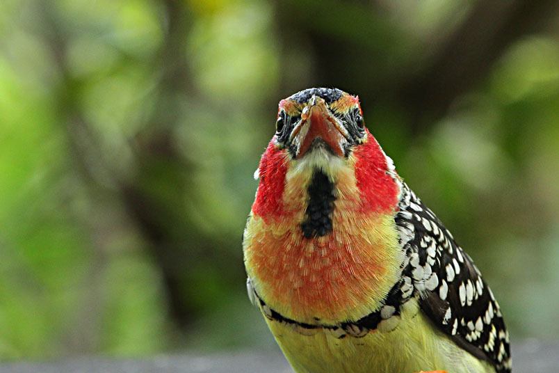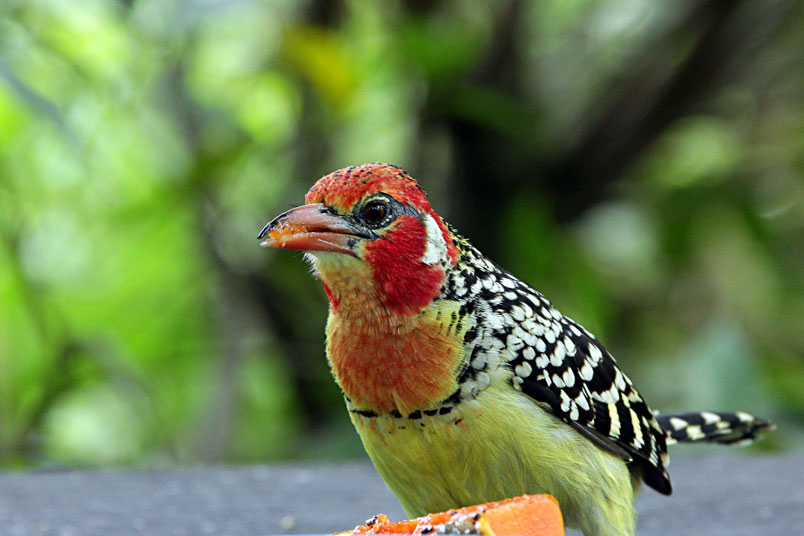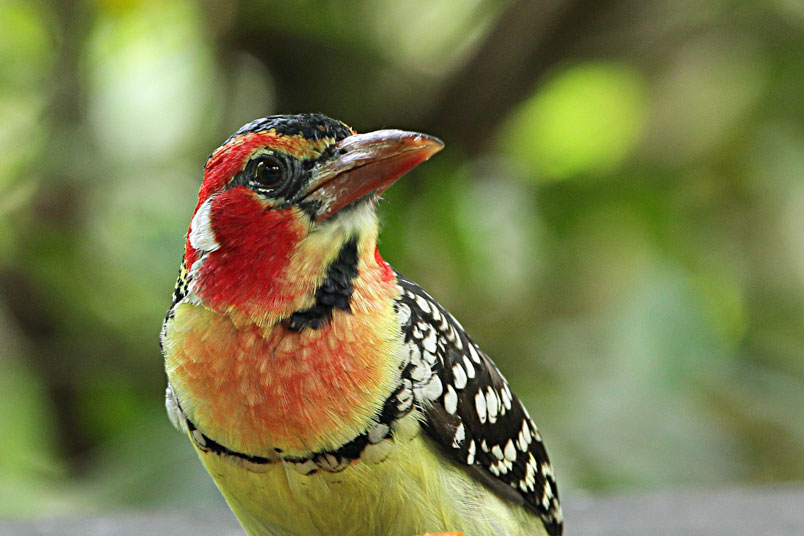 體長23公分,喙紅色,頭部黑、紅、黃色相間,頭頂和下頷各具一