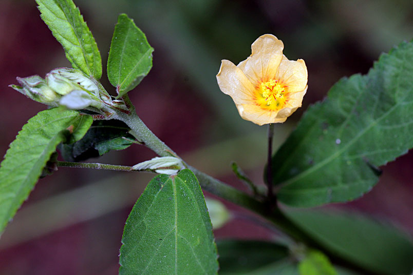 金午時花為直立亞灌木,全株被星狀毛。葉形變化多端,幼株葉